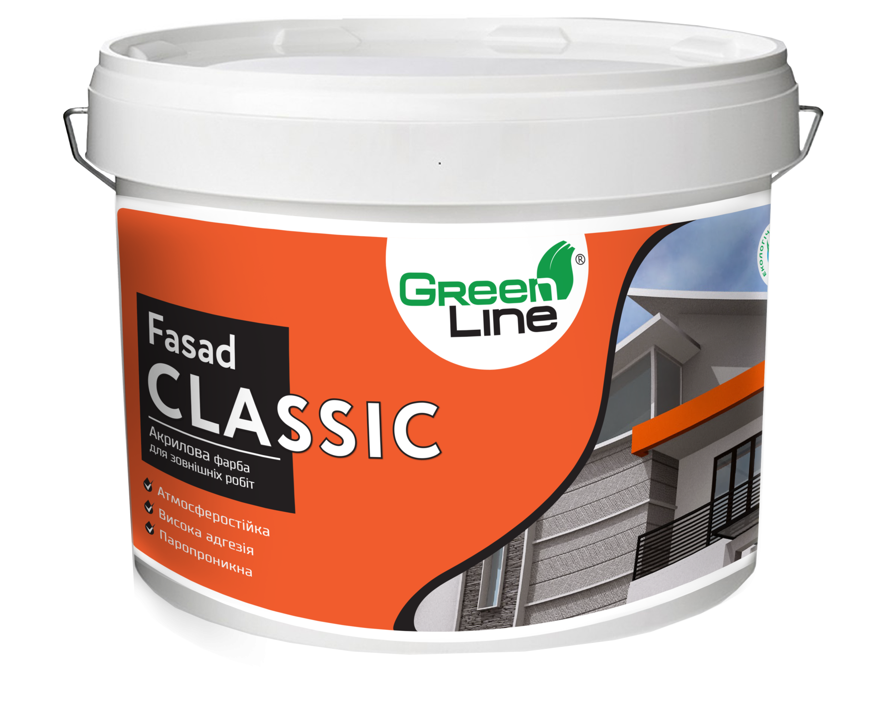 Акрилова фарба фасадна FASAD CLASSIC, ТМ GREEN LINE призначена для захисту та декорування поверхонь на фасаді будівель та всередині приміщень, а також використання як фінішний шар в системі теплоізоляції з використанням пінополістирольних плит.