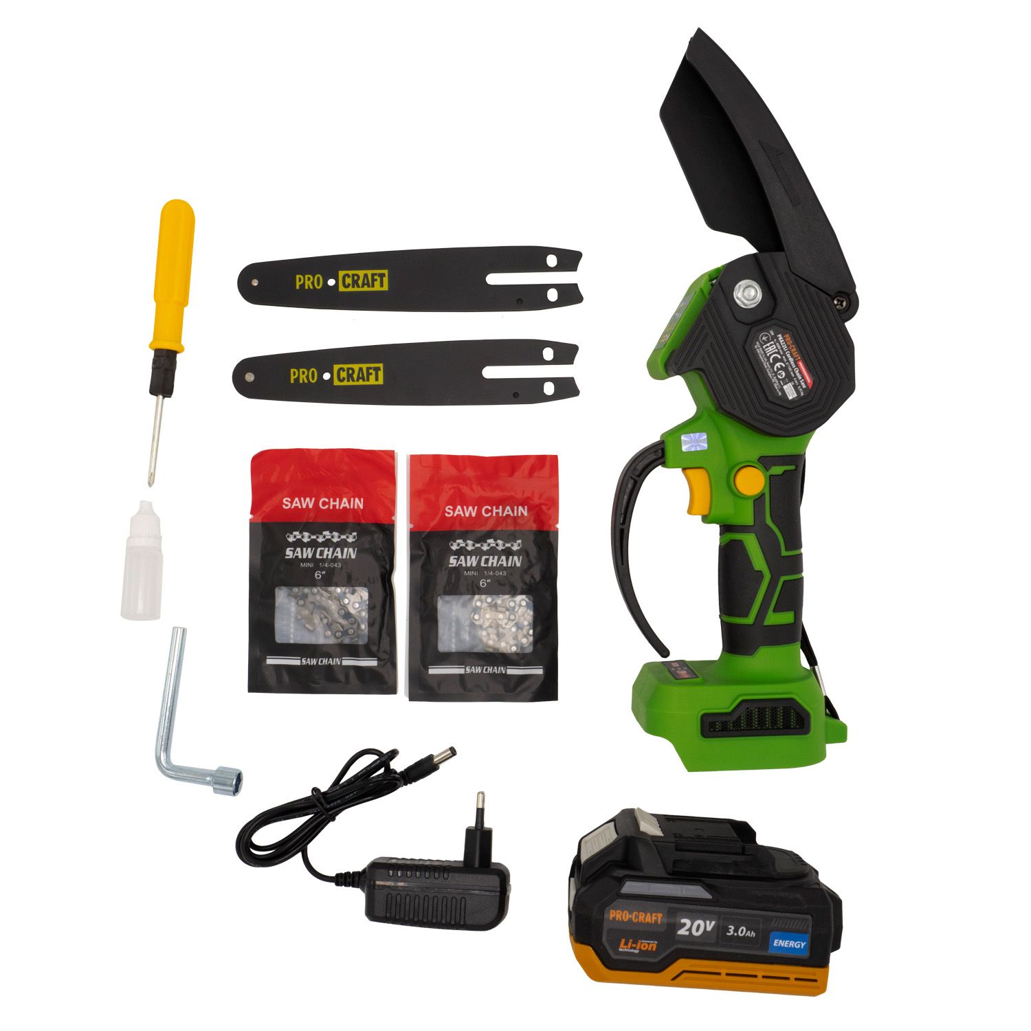 Комплектація: 1 акумулятор 3 А·год; зарядний пристрій; 2 шини; 2 ланцюги; маслянка; сервісний інструмент.