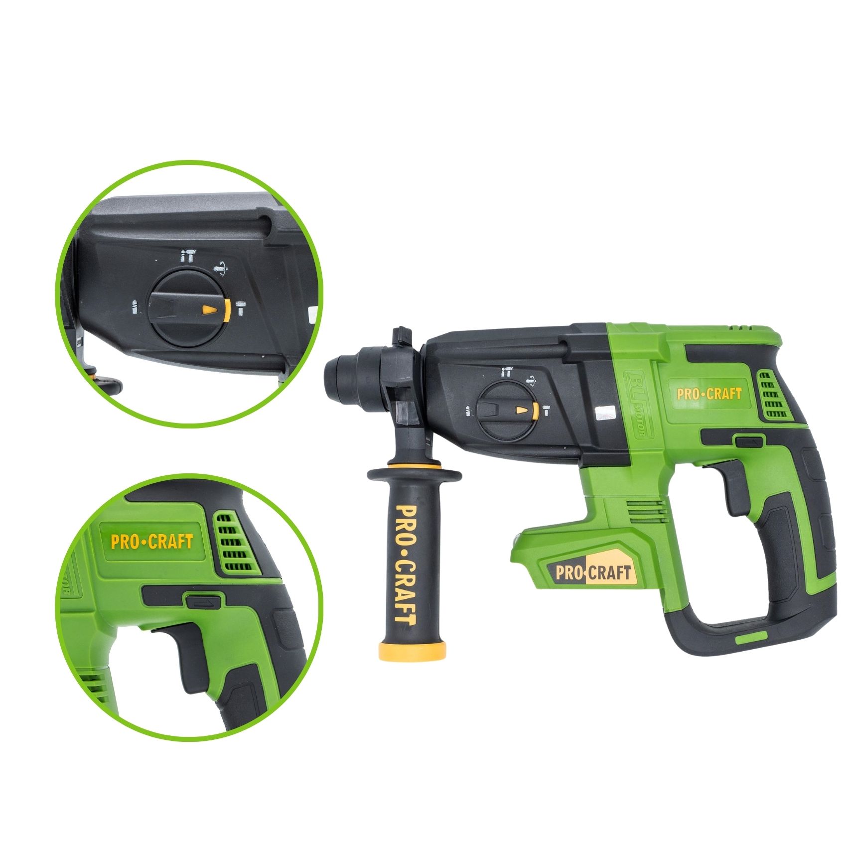 Акумуляторний перфоратор Procraft PHA40 ідеально підходить для виконання різноманітних робіт у будівництві та ремонті. Завдяки наявності трьох режимів - свердління, довбання і буріння, ви зможете легко свердлити отвори, довбати сильні матеріали та виконувати будівельні роботи зі свердлінням і ударом. Цей перфоратор дає вам можливість швидко і точно виконувати завдання будь-якої складності.