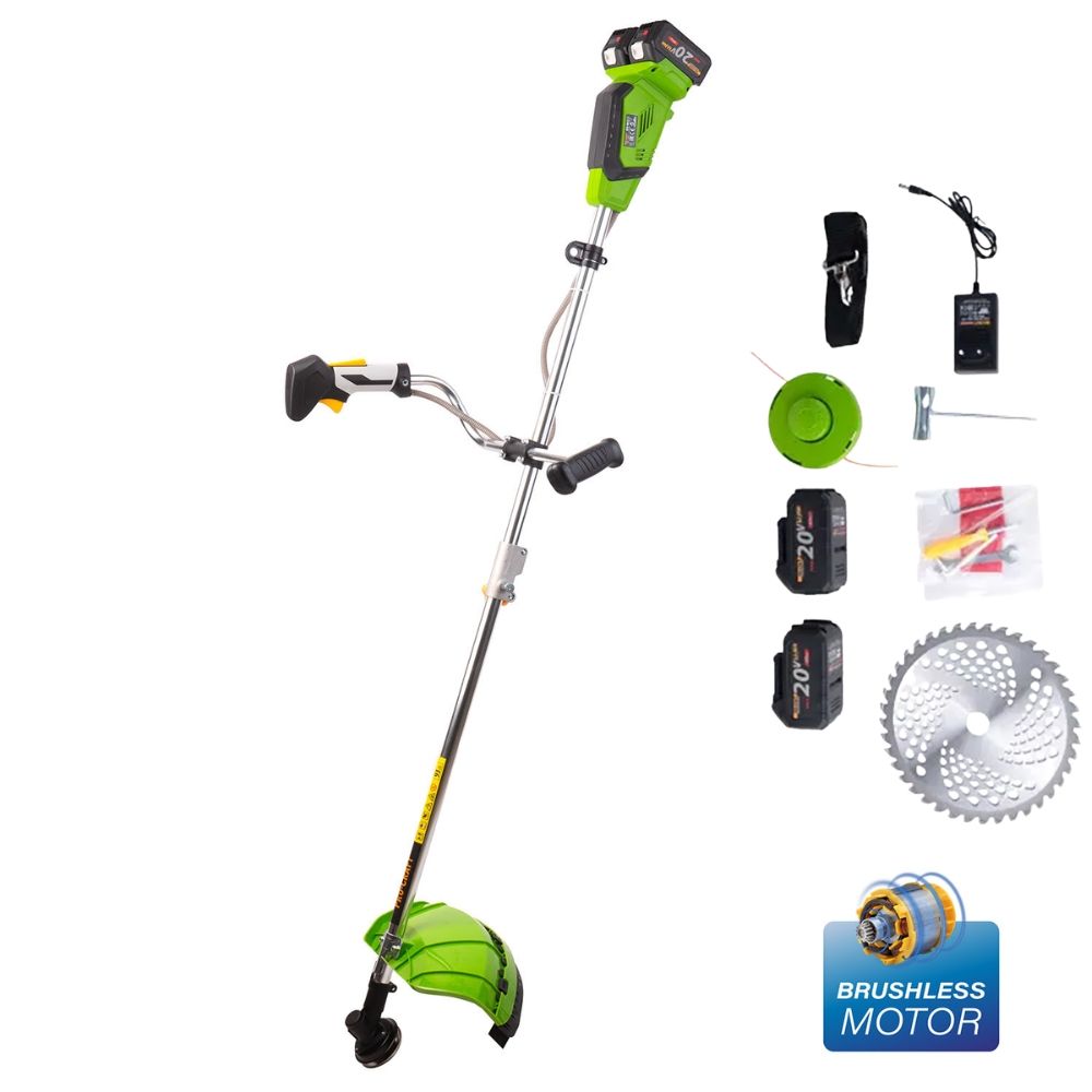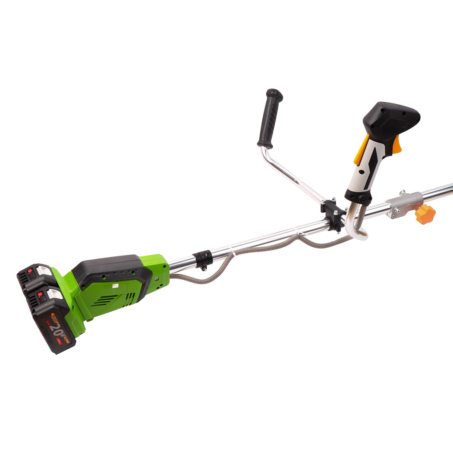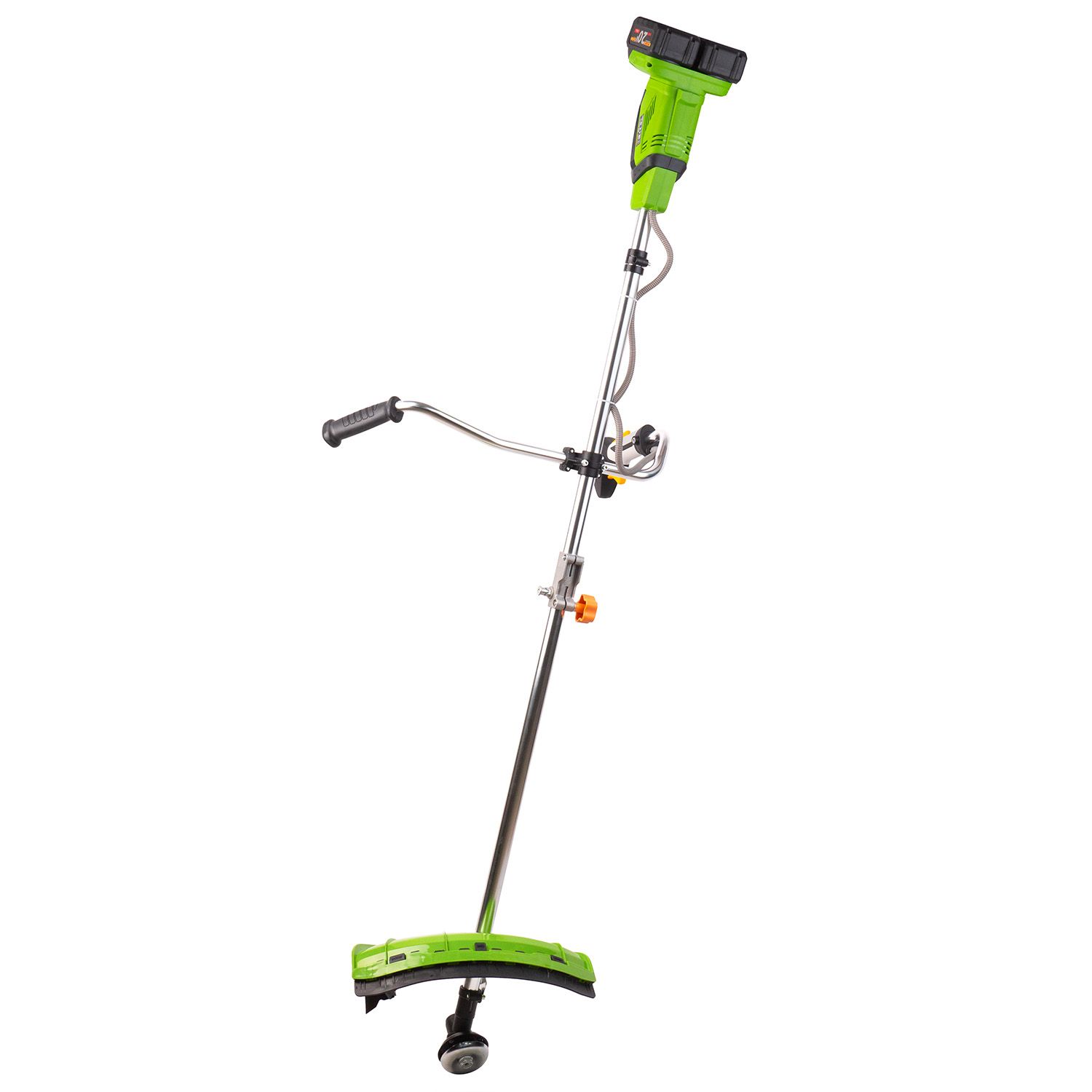 Оснащений велосипедною ручкою для зручності керування, має два акумулятори в комплекті, що забезпечує тривалість роботи без підзарядки.