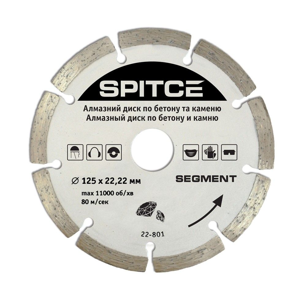 Алмазний диск по бетону, каменю 'SEGMENT' 125 мм - це високоякісний і надійний інструмент, призначений для різання каменю і бетону. Диск має алмазне покриття, що забезпечує високу ефективність і довгий термін експлуатації. Він призначений для використання з кутовим шліфувальником з посадковим діаметром 22.2 мм. Цей сегментний алмазний диск діаметром 125 мм ідеально підходить для різання різних типів каменю і бетону. Він надійно фіксується на вертикальних і горизонтальних поверхнях, дозволяючи вам швидко і легко виконувати різання з високою точністю.