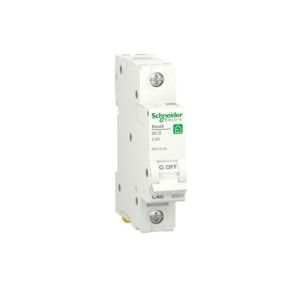 АВТ ВИМ RESI9 6kA 1P 40A C - автоматичний вимикач однополюсний з номінальною напругою 230 В та номінальною вимикальною здатністю 6 кА. Виготовлений для монтажу на Din-рейку. Має термомагнітний розчеплювач та криву вимикання С.