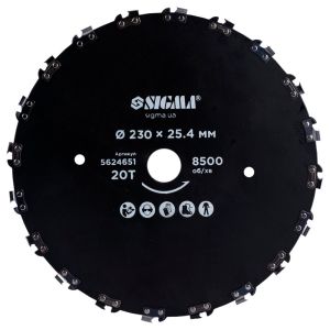 Характеристики Призначення: косіння бур’янів, очерету, чагарників і дерев товщиною до 50 мм матеріал: високоміцна сталь Ріжучий елемент: ланки від ланцюгової пилки Особливості: ланки розташовані по черзі з різних боків для зменшення ймовірності затискання Максимальна кількість обертів: 8500 об/хв Розмір: 23025.