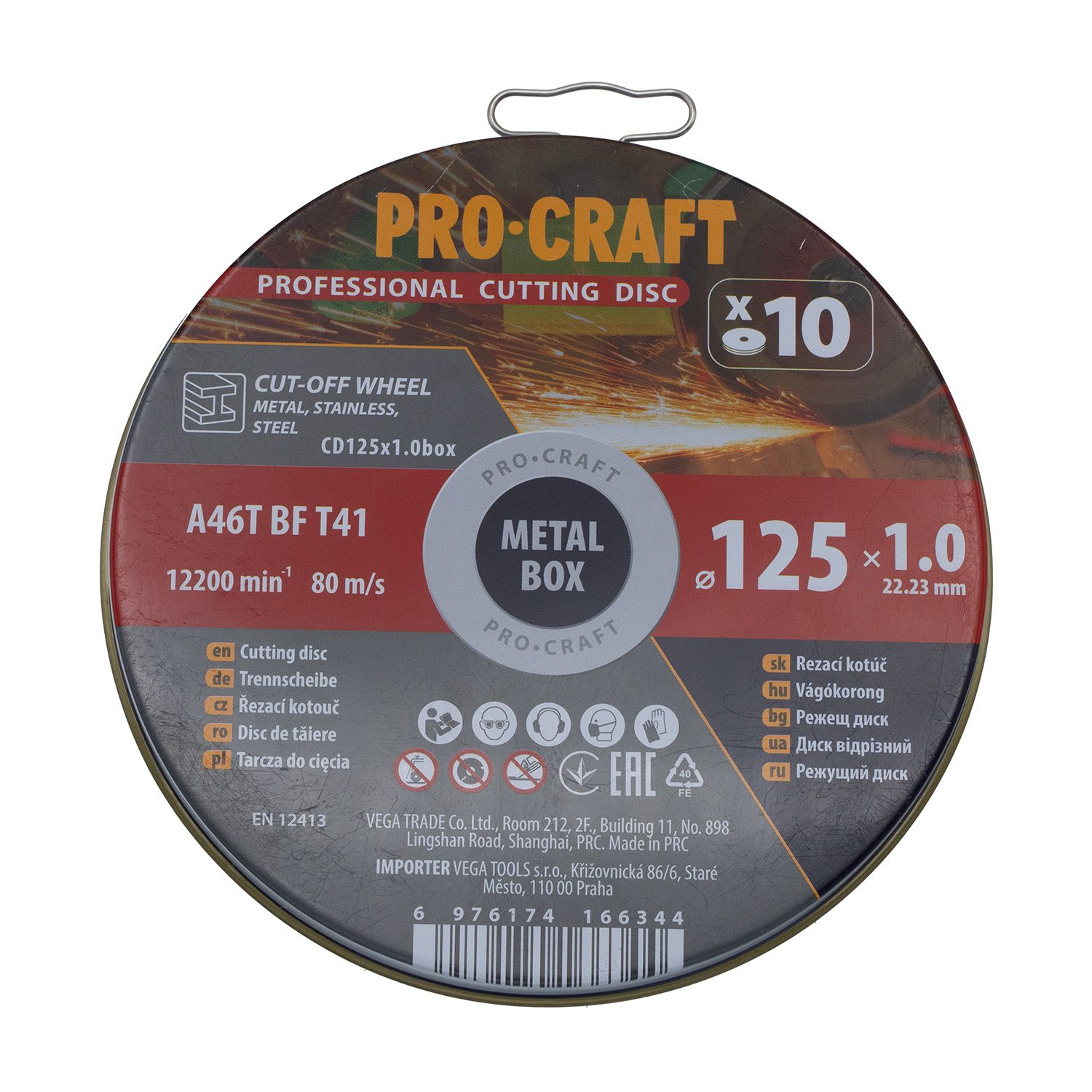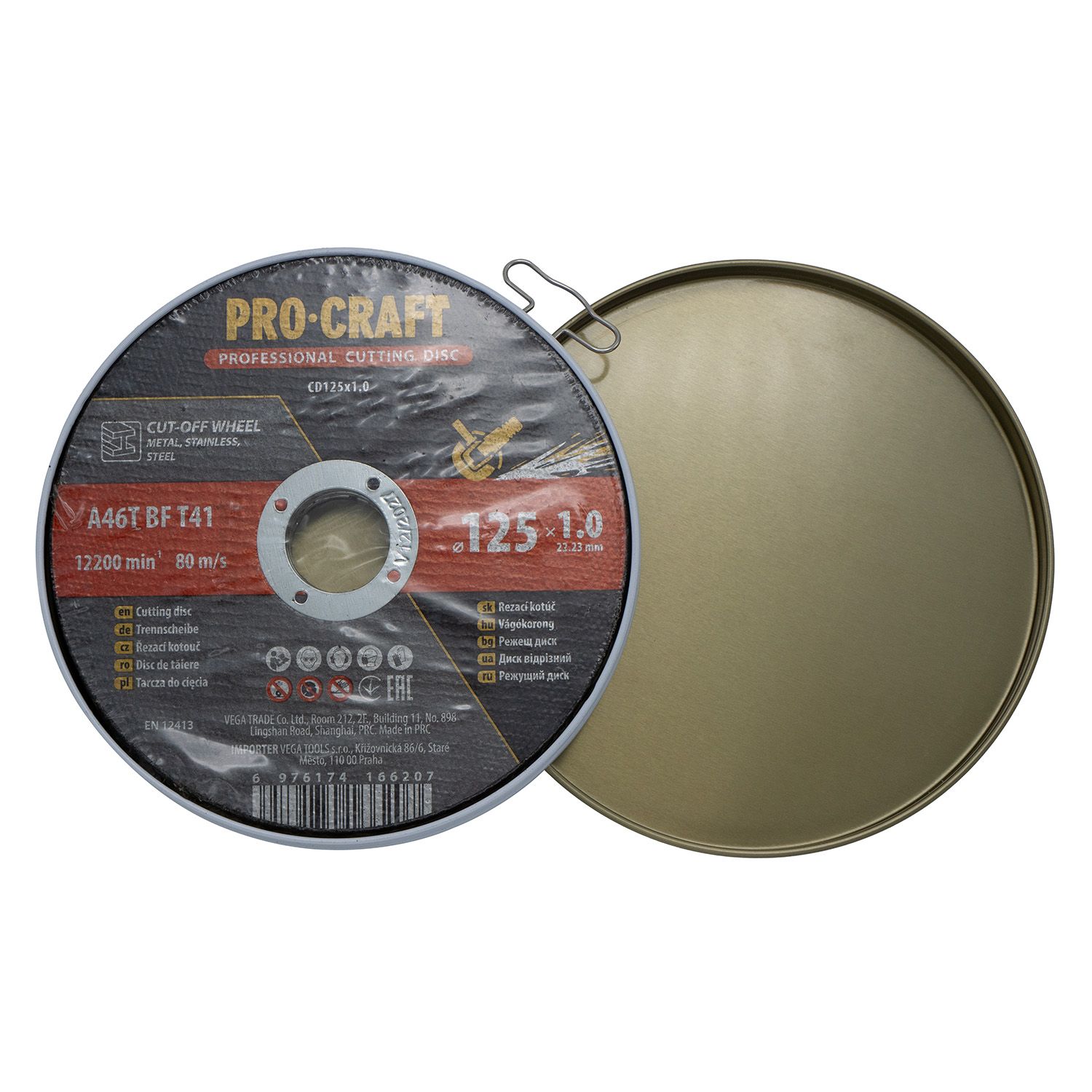 Характеристики Тип диск відрізний абразивний Зовнішній діаметр 125 мм Товщина 1,0 мм Посадковий діаметр 22,2 мм матеріал абразиву корунд Армування двошарове скловолокно Зв’язка бакелітова Кількість у упаковці 10 шт Бренд Procraft Модель CD125x1.