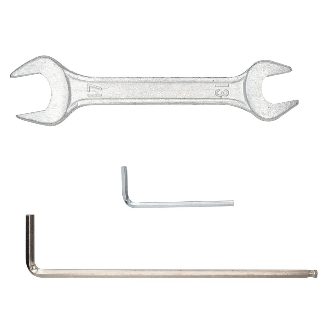Захисний кожухкруга - 1 шт Наждакові кола1 шт Наждачний стрічка1 шт Кутовий упор1 шт КлючРожковий (13 - 17 мм) Патрубок для пиловідведеннякутовий - 1 шт Шестигранні ключі2 шт (3 мм, 4 мм) Упор для стрічкового стола1 шт Гумові ніжки4 шт клейкий диск для шліфувального кола1 шт