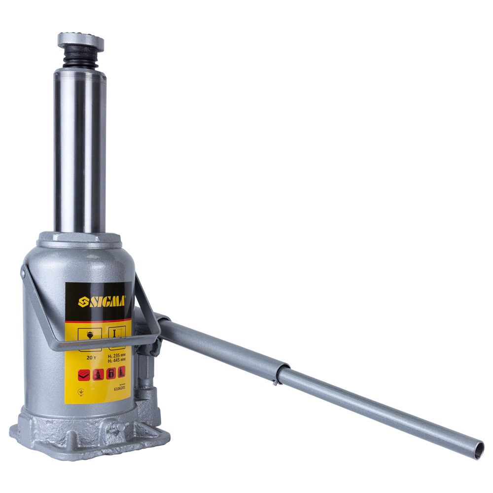 Домкрат гідравлічний пляшковий 20т H 235-445мм Standard SIGMA (6106201) відрізняється простотою конструкції і зручністю в експлуатації, що розширює область його застосування і дозволяє ефективно виконувати роботи будь-якої складності.