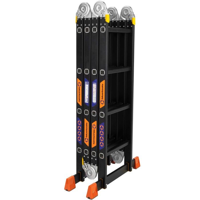 Характеристики Модель: BLUETOOLS BLACK 160-9016 Конфігурація: 4 секції, 4 сходинки в кожній (16 сходинок) Максимальне навантаження: 150 кг Висота у конфігурації стрем’янки: 2,27 м Висота у вигляді помосту: 1,26 м Висота приставної драбини: 4,70 м Висота в складеному вигляді: 1,26 м Вага: 13,8 кг Додаткові елементи: рифлені сходи, посилені замки, антиковзкі ніжкиПереваги Один інструмент — три варіанти використання: стрем’янка, драбина, поміст Висока несуча здатність — до 150 кг Висока довговічність завдяки міцній алюмінієвій конструкції Рифлені сходинки та антиковзкі ніжки забезпечують безпеку Компактне складання для легкого транспортування і зберігання Сучасний дизайн у чорному виконанні