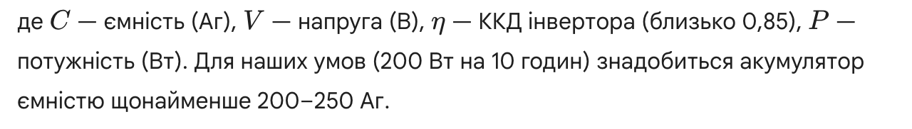 Розрахунок ємності АКБ. Час роботи прямо залежить від напруги системи (зазвичай 12В або 24В) та ємності батарей. Для підтримки 200 Вт протягом 10 годин знадобиться значний запас енергії.