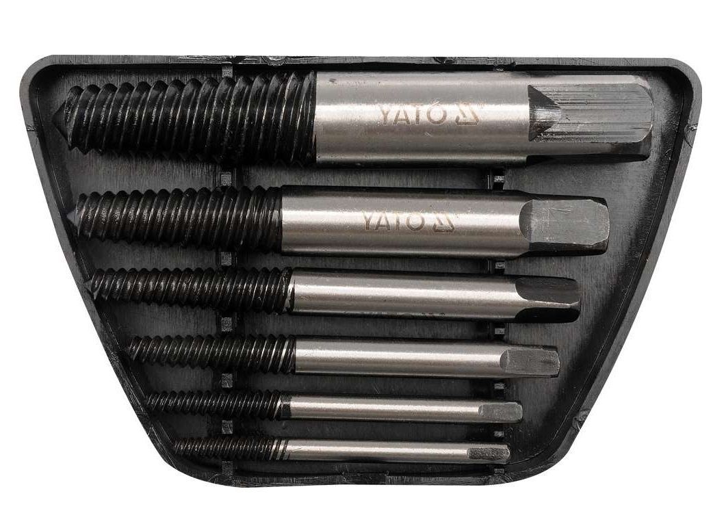 Набір відмичників для зламаних гвинтів та шпильок діаметром 3-14 мм, комплект із шести екстракторів, виробництва YATO (модель YT-0590), є рішенням для видалення поламаних гвинтів і шпильок різних розмірів.
