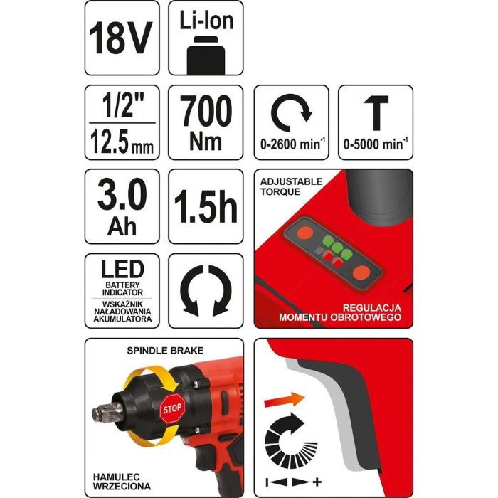 Акумуляторний гайковерт YATO YT-82806 з крутним моментом до 700 Нм — це потужний інструмент, що поєднує в собі безщітковий двигун та надійний ударний механізм. Оснащений літій-іонною батареєю, він забезпечує стабільну роботу та тривалий час автономної дії. Гайковерт має триступеневе регулювання крутного моменту (400, 550 і 700 Нм) та світлодіодний індикатор для зручності користування.