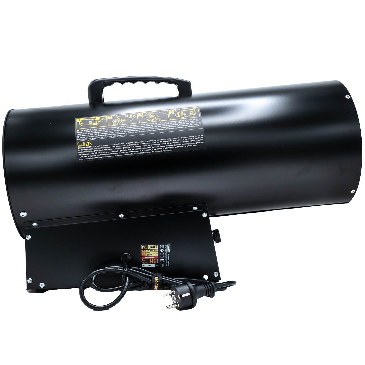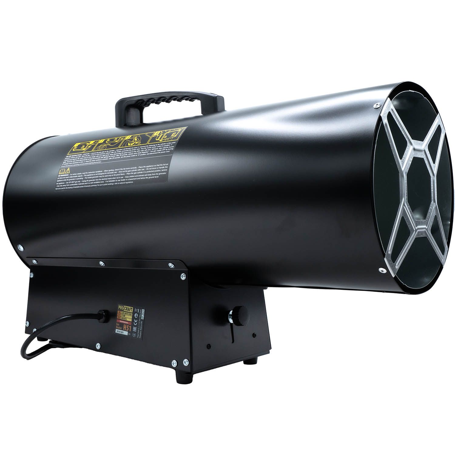 Технічні характеристики: Теплова потужність: 51 кВт Витрата газу: 3,7 кг/год (пропан/бутан) Тиск подачі газу: 1,5 бар Розмір форсунки: 1,38 мм Запалювання: п’єзозапалювання Живлення вентилятора: 220–240 В, 50 Гц Клас ізоляції: I Ступінь захисту: IP44 Автоматичне відключення при перегріві: 75 °C Рівень шуму: до 63 дБ Вага: близько 6,8 кгПереваги моделі: Висока теплова потужність для ефективного обігріву великих площ Низький рівень шуму під час роботи Автоматичний захист від перегріву П’єзозапалювання — швидкий і безпечний запуск Компактний корпус і зручність у транспортуванніКомплектація: Газова теплова гармата Procraft H51 Шланг для газу Редуктор Інструкція з експлуатації Увага!