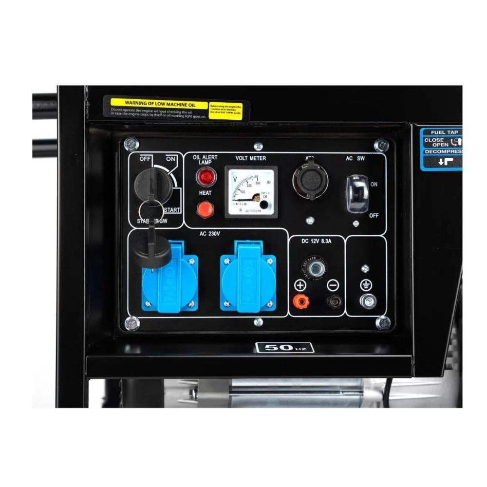 Характеристики Виробник: TAGRED Модель: TA7350D Тип: дизельний генератор Потужність номінальна: 4,2 кВт Потужність максимальна: 5,0 кВт Напруга: 230 В (однофазний) Частота: 50 Гц Двигун: 4-тактний дизельний, повітряне охолодження Об’єм двигуна: 531 см Об’єм паливного бака: 12,5 л Об’єм оливи: 1,7 л Витрата палива: орієнтовно 1,5–1,8 л/год Тривалість роботи на одному баку: до 8 годин (залежно від навантаження) Система запуску: ручний + електростартер Рівень шуму: 69 дБ (на відстані 7 м) Клас захисту: IP23 Захист: від перевантаження, від низького рівня оливи Вага: 113 кгКомплектація Генератор дизельний TAGRED TA7350D — 1 шт.