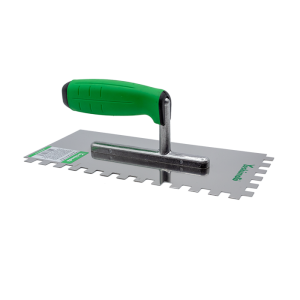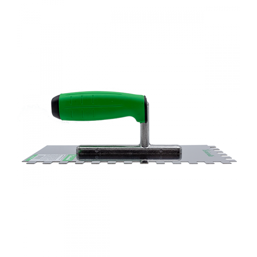 Гладилка нержавіюча Yoshimoto з 2К ручкою, зуб 10x10 мм, 270 мм — професійний інструмент для нанесення клейових розчинів під час укладання плитки, монтажу газоблоків чи утеплення фасадів.