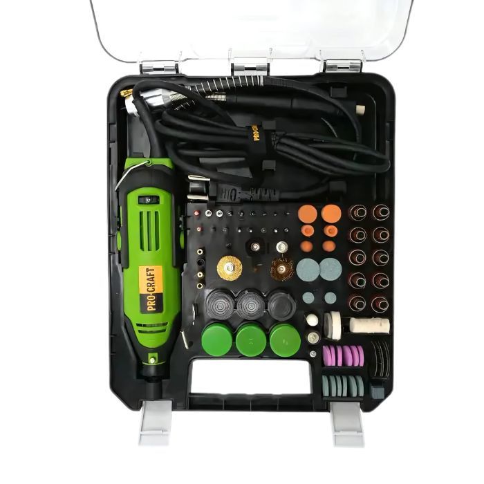 Гравер Procraft PG520 — це потужний інструмент, призначений для точної обробки матеріалів. Він працює при напрузі 220-240 В і частоті 50 Гц, споживаючи 180 Вт потужності. Гравер має регульовану швидкість обертання в діапазоні від 1000 до 32000 об/хв, що дозволяє адаптувати його до різних завдань.