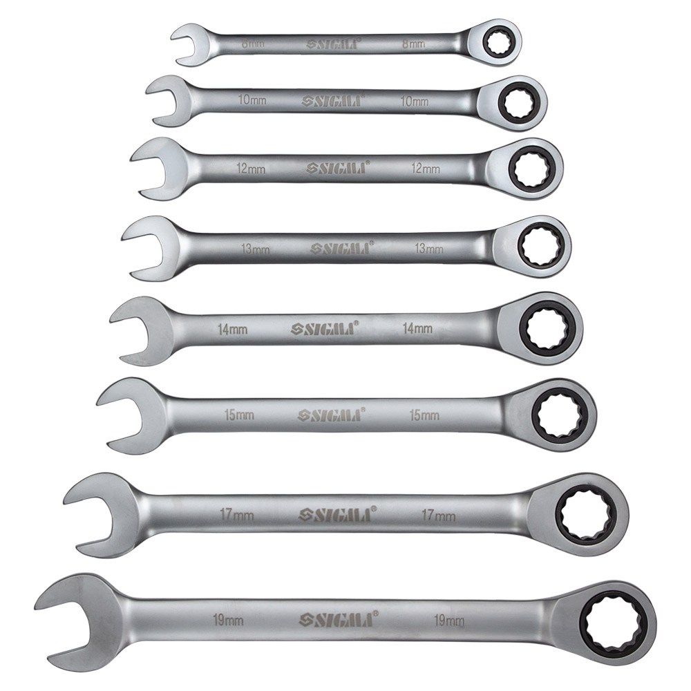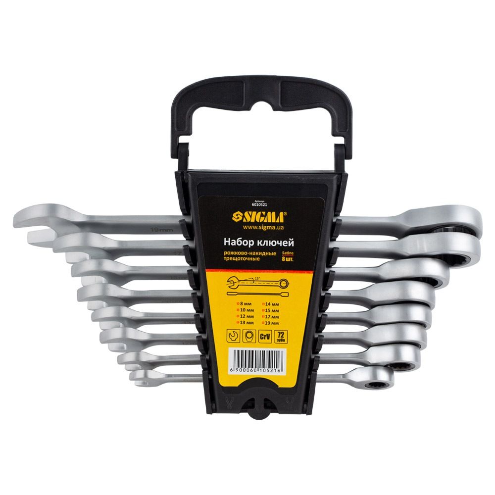 Ключі ріжково-накидні з тріскачкою 8шт (8, 10, 12, 13, 14, 15, 17, 19мм) CrV SIGMA (6010521) - використовується для роботи з болтовими з'єднаннями (для відкручування або закручування гайок і болтів).
