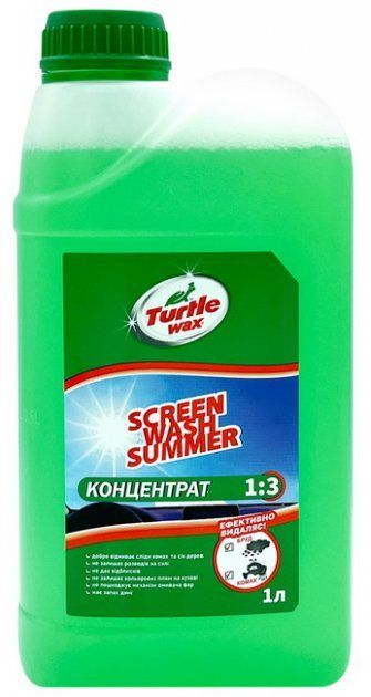 Концентрат літнього омивача автомобільного скла 'Turtle Wax' 3:1 можна застосовувати для миття скла легкових і вантажних автомобілів під час літнього періоду. Він ефективно видаляє відкладення, бруд і наліт, залишаючи скло обережно очищеним і прозорим.