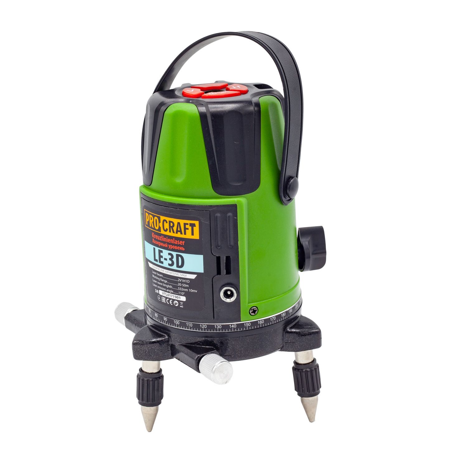 Лазерний рівень Procraft LE-3D - це надійний і потужний інструмент для виконання різних робіт з регулювання та рівняння. Його вага становить 1,58 Кг, що дозволяє комфортно його транспортувати. Завдяки дальності променя 15 метрів, ви зможете легко і точно визначити рівень горизонталі та вертикалі. Колір променя - зелений, що забезпечує хорошу видимість в різних погодних умовах. Цей лазерний рівень належить до класу 2, що гарантує його безпечне використання. Час автономної роботи становить більше 3 годин, що дозволяє виконувати роботу без перерви. Робоча температура від +5 °С до +40 °С забезпечує роботу лазерного рівня в різних умовах. Даний є ідеальним вибором для будівельних робітників, архітекторів, дизайнерів та всіх, хто потребує точного вимірювання та рівняння. Він є надійним помічником на будівництві, ремонті та різних видів ремонтних робіт.