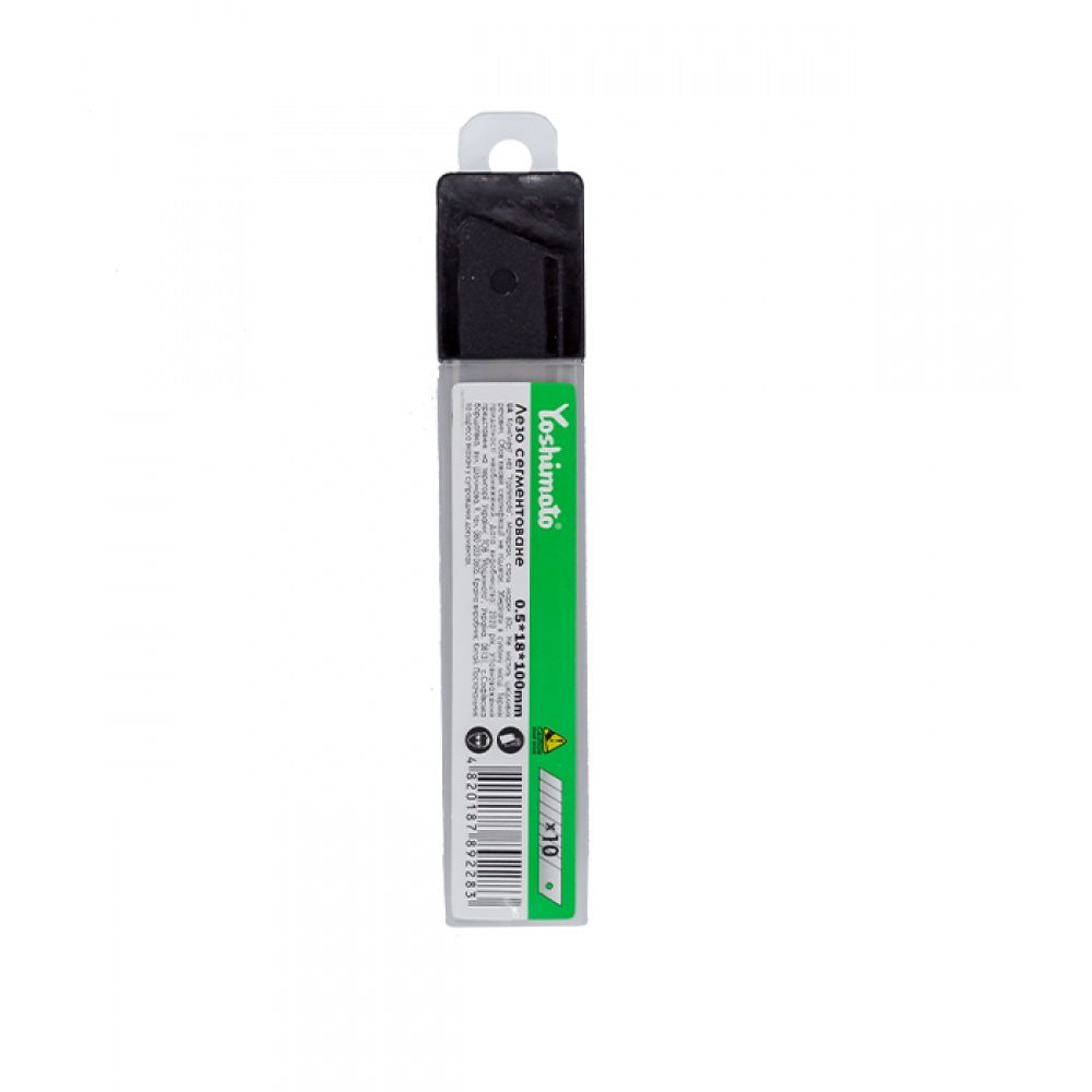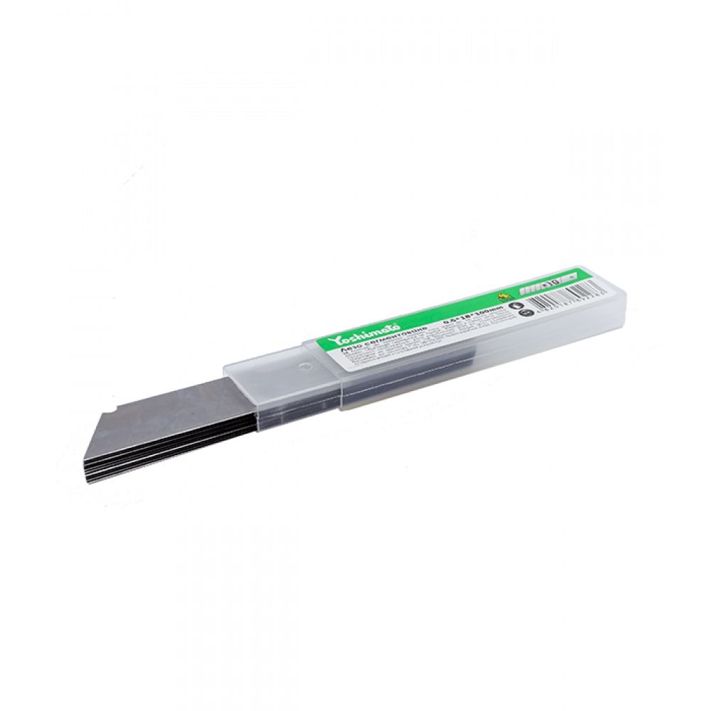Характеристики: Бренд: Yoshimoto Тип: трапецієподібне лезо матеріал: сталь марки 60 Твердість: 58 HRC Сфера застосування: гіпсокартон, папір, дерево, інші нетверді матеріали Кількість у наборі: 10 шт.