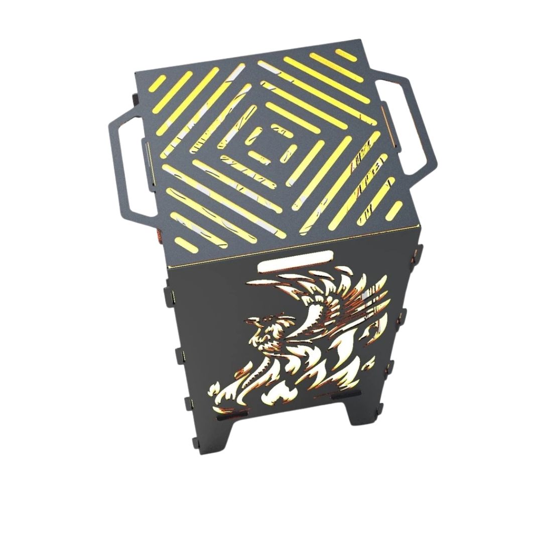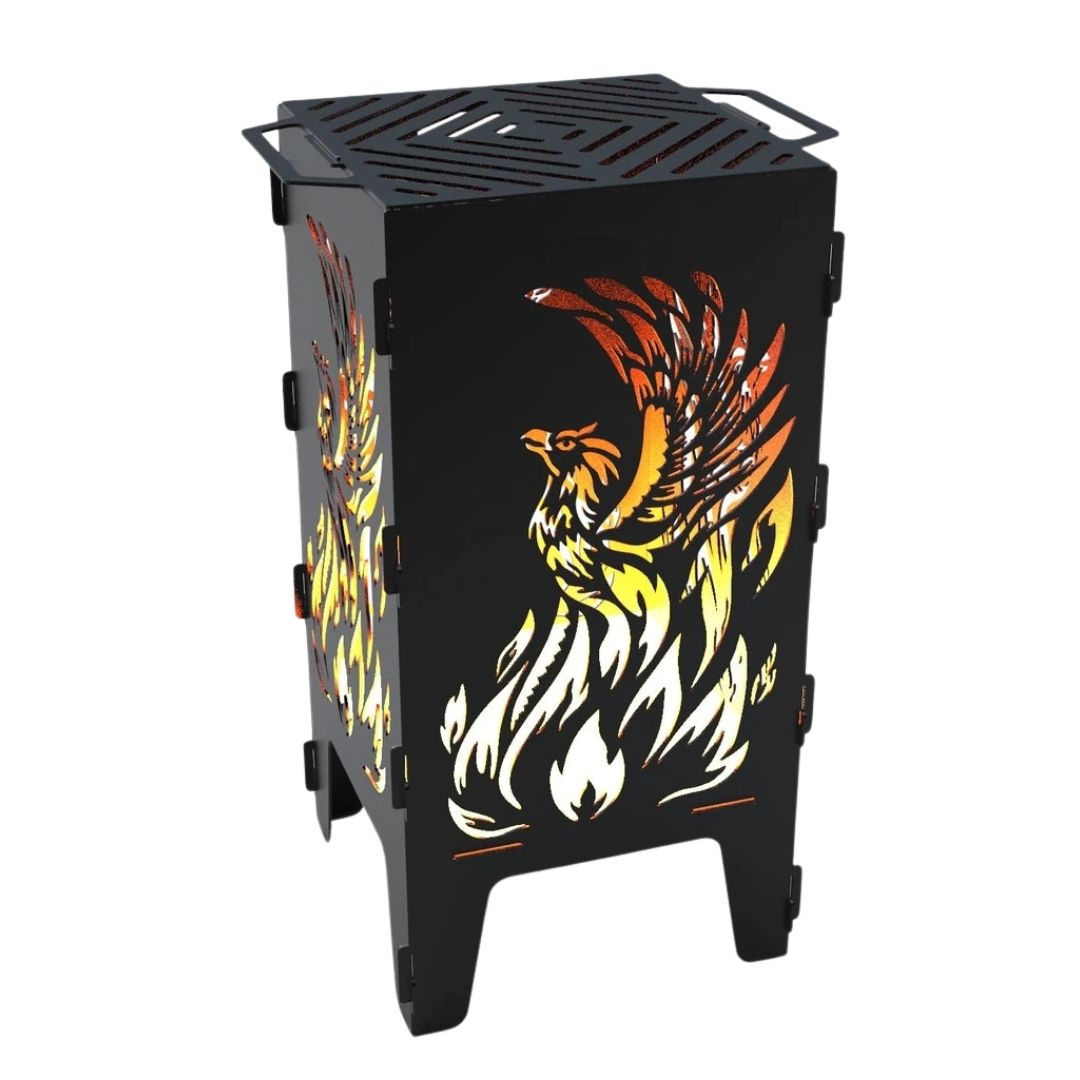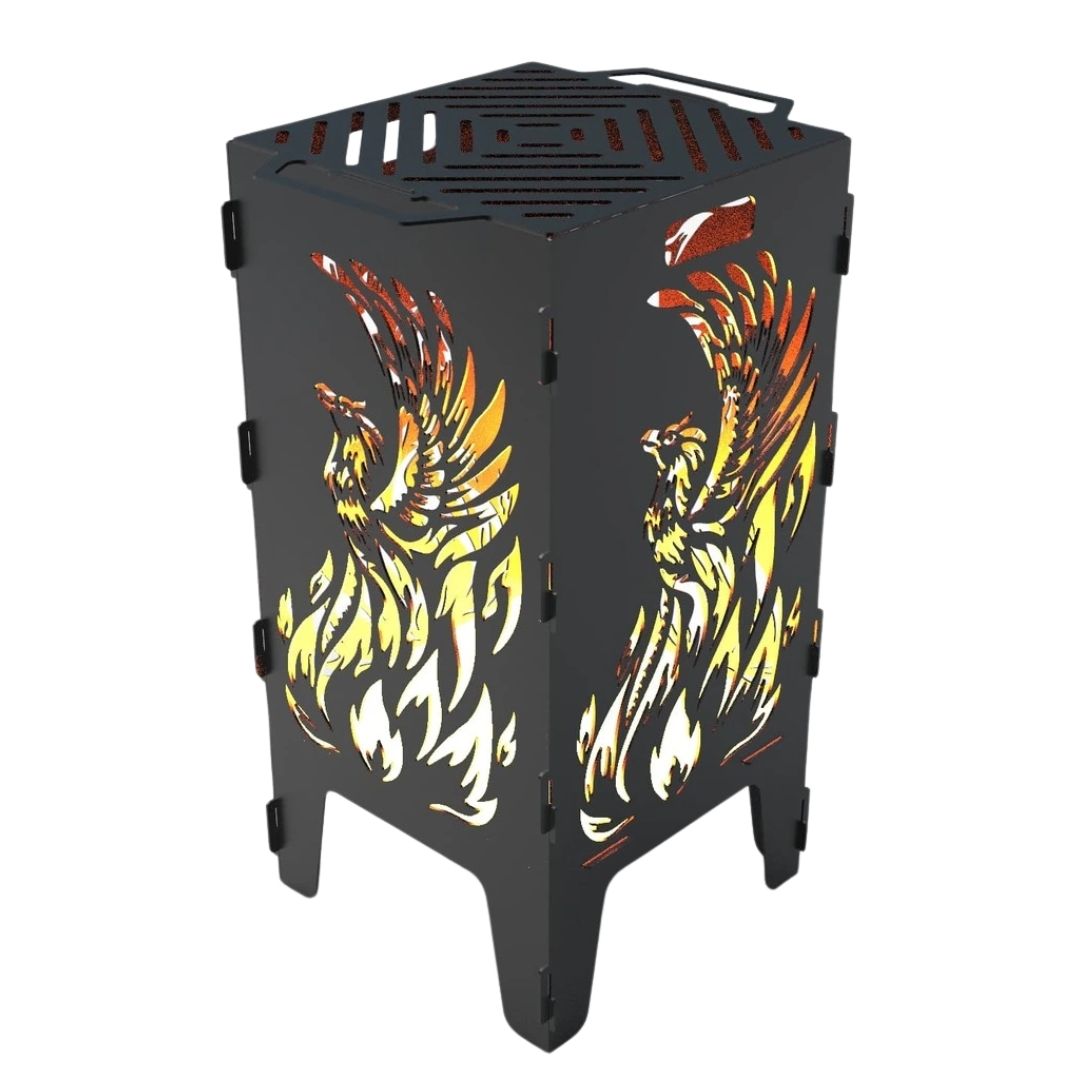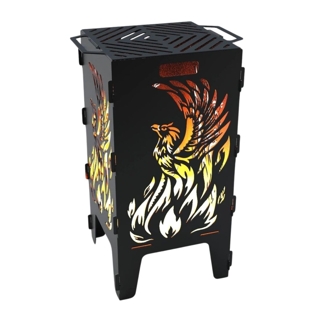Мангал-барбекю Carino Фенікс — розбірна модель з виразним дизайном, що поєднує функціональність і декоративний вигляд. Виріз із зображенням фенікса створює ефект підсвічування під час горіння та додає атмосферності зоні відпочинку. Конструкція зручна у транспортуванні, а метал товщиною 3 мм забезпечує надійність і тривалий ресурс використання.