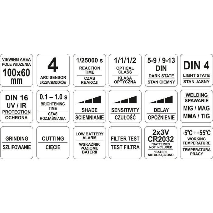 +55 Світлий стан: DIN 4Сфери застосування:Завдяки своїм властивостям, дана маска ідеально підходить для професіонального зварювання різних матеріалів, таких як сталь, алюміній, нержавіюча сталь тощо.