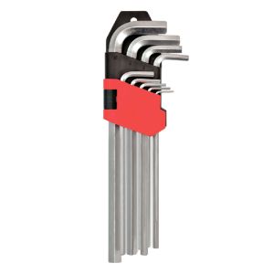Цей набір ключів імбусових подовжених має форму головки у вигляді зірочки (torx) та L-подібну форму ключа. Виготовлений з хром-ванадієвої сталі. Розміри ключів від 1,5 до 10 мм. Цей набір має такі Особливості: {Розмір: 1,5 мм, 2 мм, 2,5 мм, 3 мм, 4 мм, 5 мм, 6 мм, 8 мм, 10 мм}. Використовується для роботи з важкодоступними роз'ємами та гвинтами зі зірочкою. Даний набір є високоякісним та надійним інструментом для професіоналів та любителів.