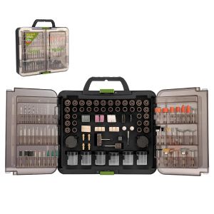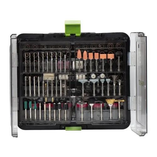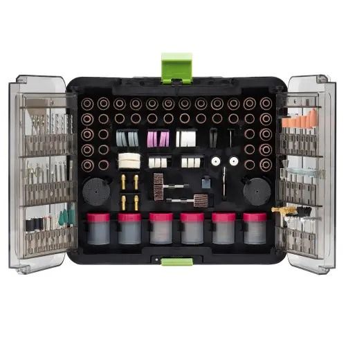 У наборі 418 елементів, серед яких: абразивні диски, фрези, щітки, полірувальні насадки, свердла та інші допоміжні аксесуари.