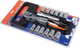 Набір має 15 насадок різних розмірів, що дозволяє зручно виконувати ремонтні роботи на автомобілях. Також у наборі є подовжувач для роботи у важкодоступних місцях.