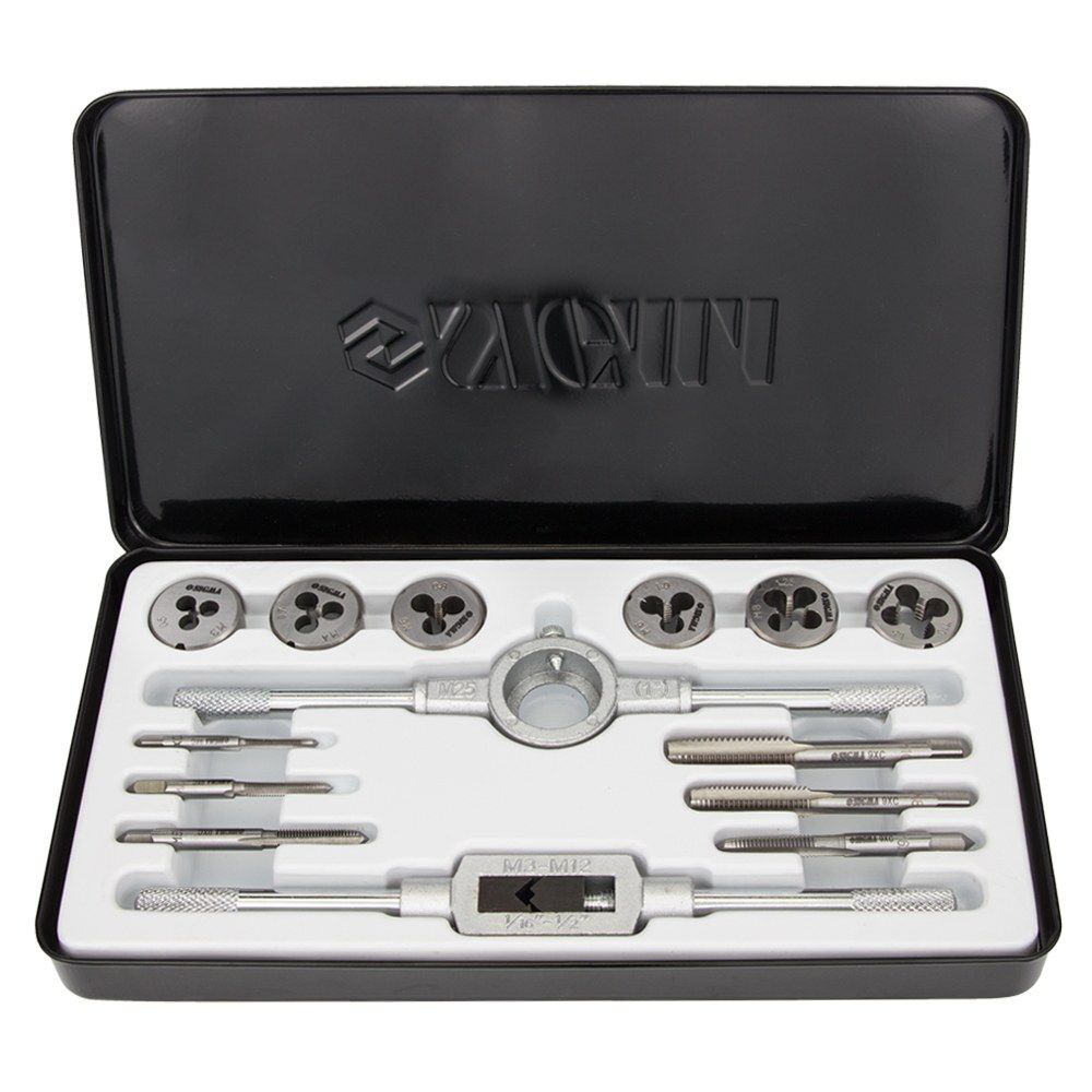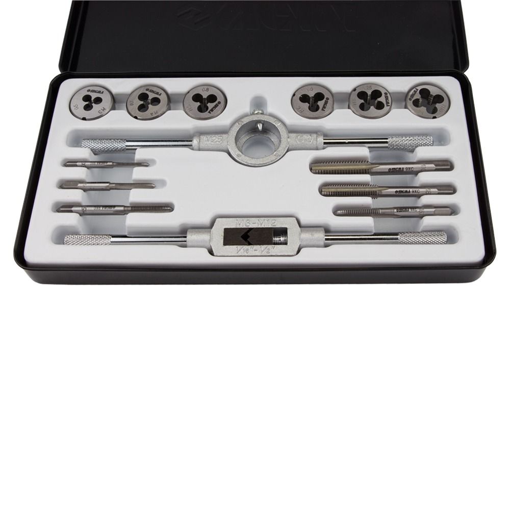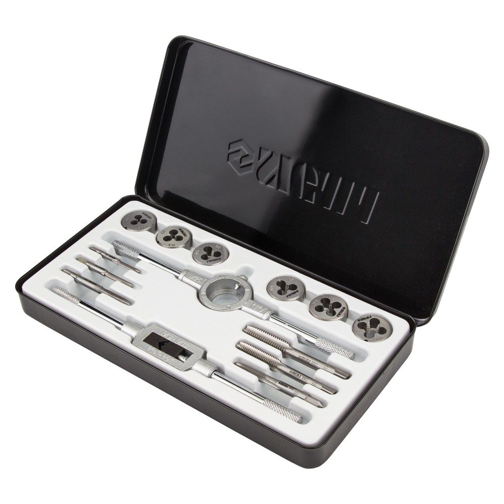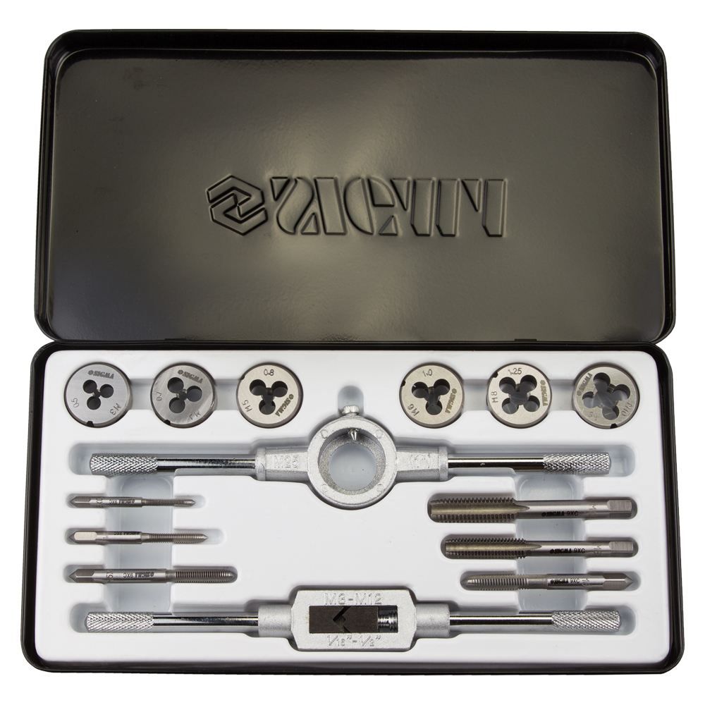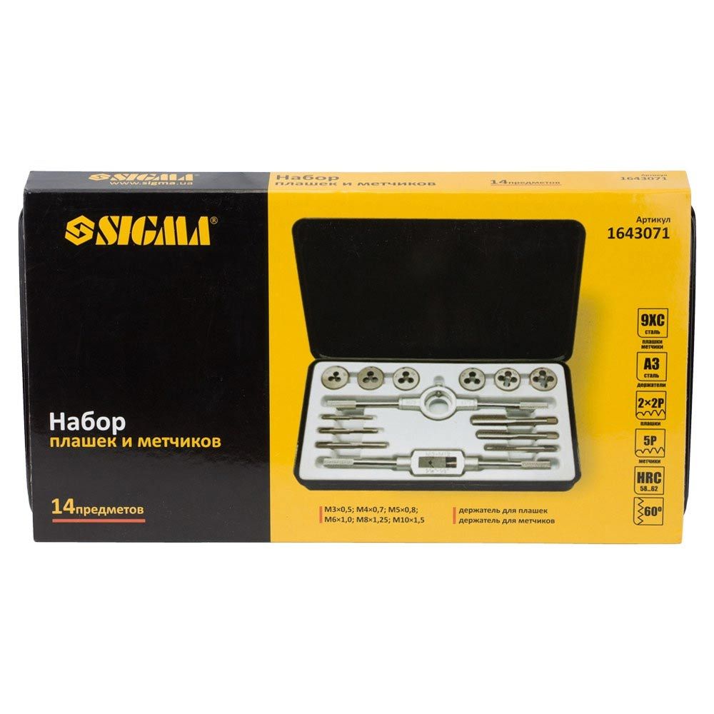 Набір плашок і мітчиків 14 предметів (металевий кейс) SIGMA (1643071) призначений для нарізування внутрішньої та зовнішньої метричної різьби на металевих виробах, для калібрування і відновлення пошкоджених ділянок різьблення. При нарізанні, різьблення, попередньо, змащують консистентним мастилом.