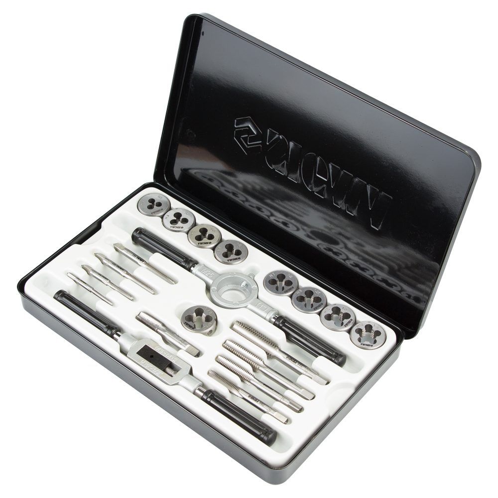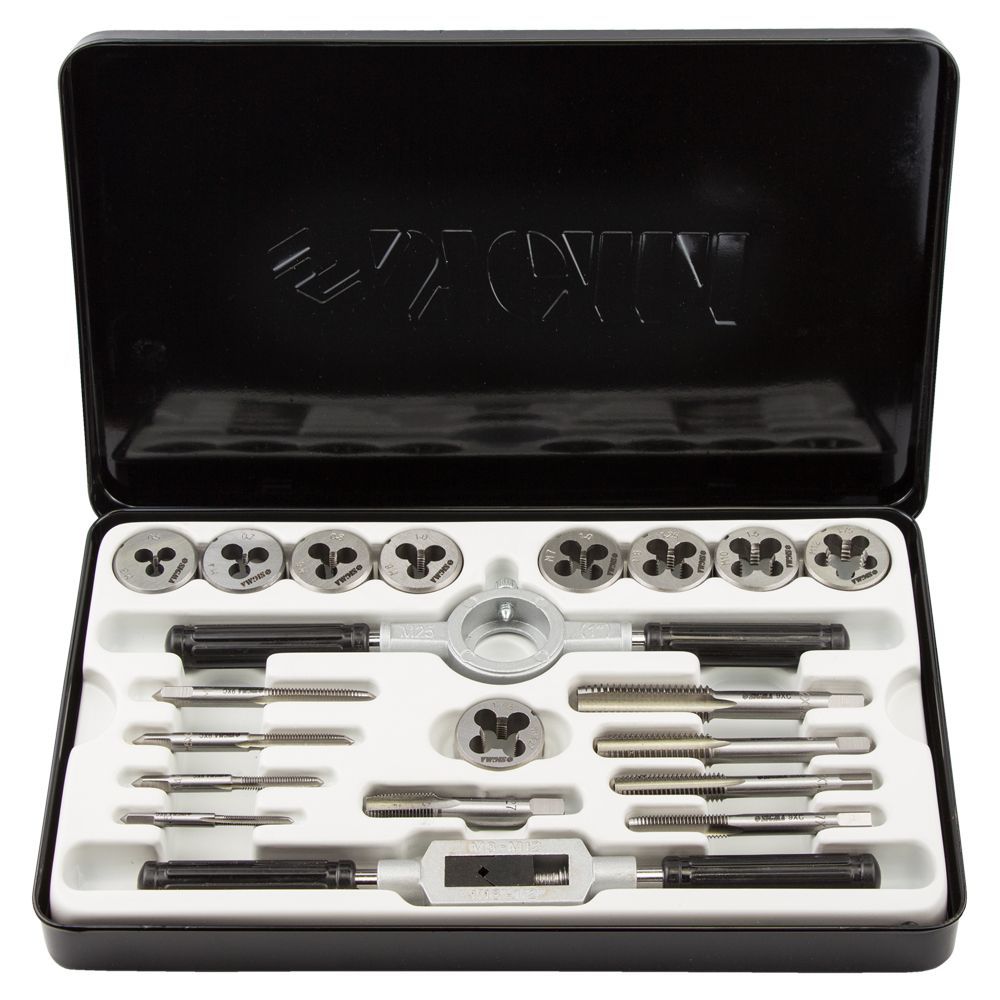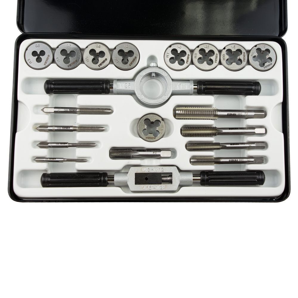 Набір плашок і мітчиків 20 предметів (металевий кейс) SIGMA (1643111) призначений для нарізування внутрішньої та зовнішньої метричної різьби на металевих виробах, для калібрування і відновлення пошкоджених ділянок різьблення. При нарізанні, різьблення, попередньо, змащують консистентним мастилом.