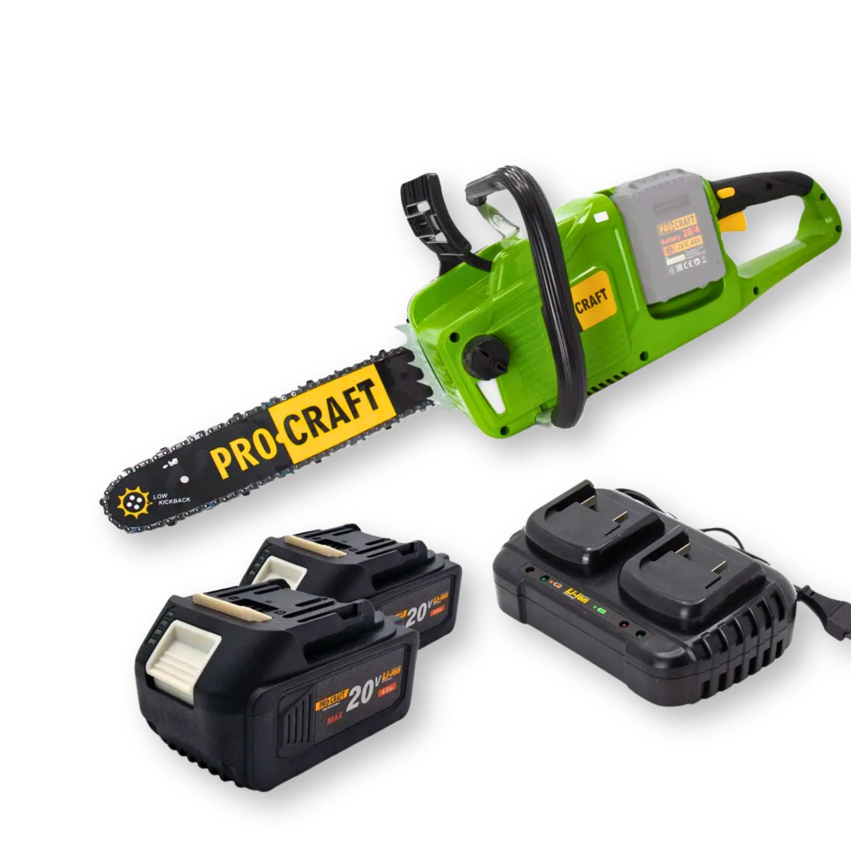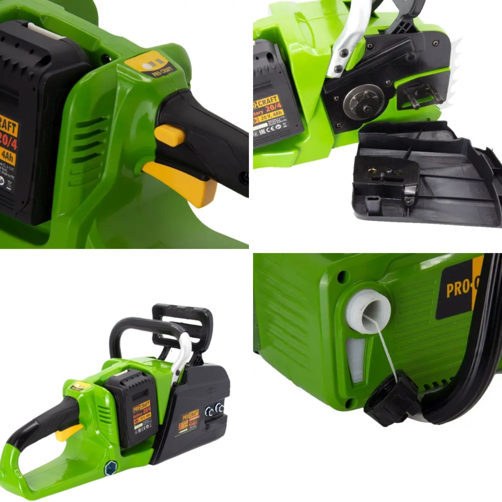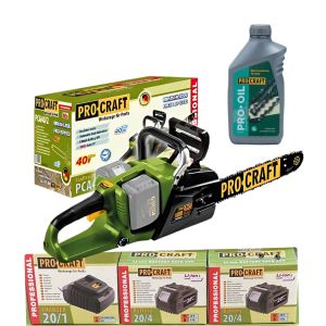 Набір Procraft Пила ланцюг.PCA40/4/2 - це потужний і надійний інструмент для різання деревини. Вага пилки складає 4,4 кг. Довжина шини - 350 мм. У комплекті немає акумулятора, але є можливість підключення зарядного пристрою. Особливість пилки полягає в блокуванні кнопки увімкнення, що забезпечує безпеку користування. Потужність пилки забезпечується безщітковим двигуном з напругою 20 В. Крок ланцюга - 3/8" Lp. Двигун пилки розташований поздовжньо, що забезпечує зручне та ефективне різання.