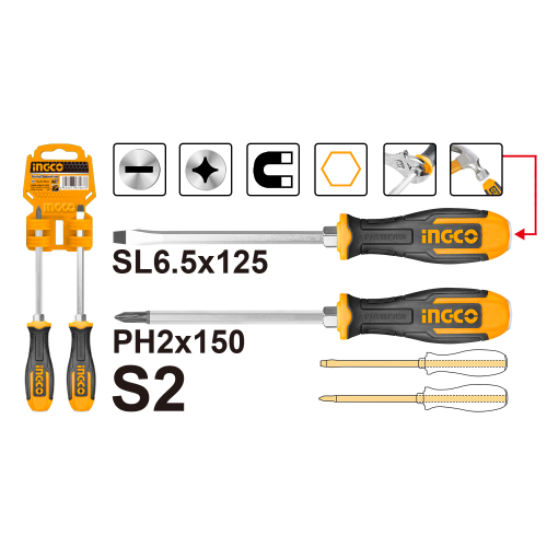 Додаткові унікальні властивості і переваги набору викруток 2 шт. INGCO INDUSTRIAL: антикорозійне покриття для захисту від ушкоджень, мале сопротивление на скользящих поверхностях, можливість заміни біти викруток для забезпечення різних видів робіт.