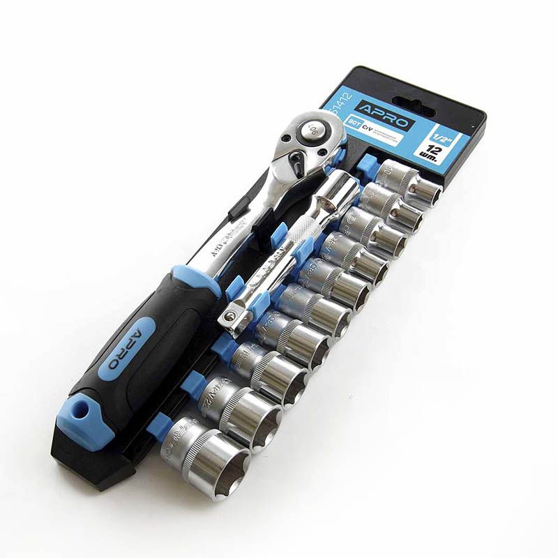 Основні переваги набору насадок 90Т CrV Apro 1/2 12 шт: висока якість виготовлення, тріскачка для зручності роботи, широкий спектр застосування, надійність та довговічність.