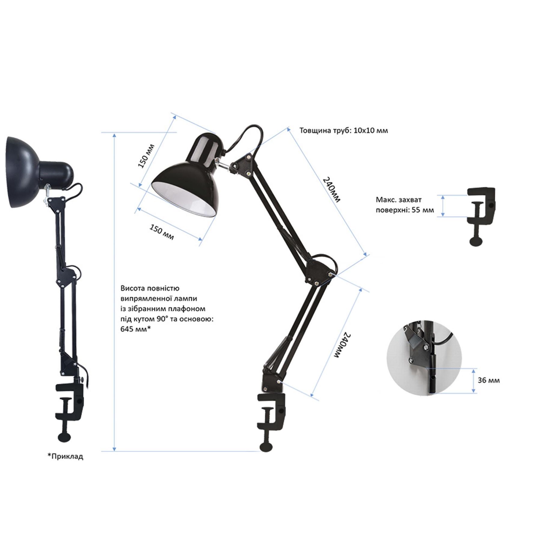 Настільна лампа Євросвітло Ridy-027 E27 зі струбциною чорна потрібна для тих ситуацій, коли на робочому столі важливий кожен сантиметр. Вона кріпиться на край столу або полиці, тому не займає місце на поверхні та дозволяє організувати освітлення без перестановок і компромісів.