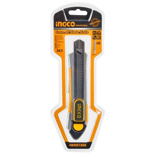 Ніж сегментний 18 мм алюмінієвий INGCO INDUSTRIAL використовується для розрізання паперу, картону, підлогових покриттів і інших матеріалів.