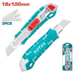 Ніж із відламуючим лезом TOTAL THT522136 має висувний дизайн і підходить для різання паперу, картону, шпалер, тонких килимів та інших матеріалів. Лезо довжиною 100 мм і шириною 18 мм виготовлене з японської вуглецевої сталі SK5, що забезпечує високу міцність і тривалий термін служби. Прогумована пластикова ручка з ергономічним контуром гарантує надійне та комфортне захоплення без ковзання. У комплекті йдуть три запасні леза. Ніж упакований у зручну висувну карту для зберігання та транспортування. Ідеальний інструмент для точного і легкого різання.