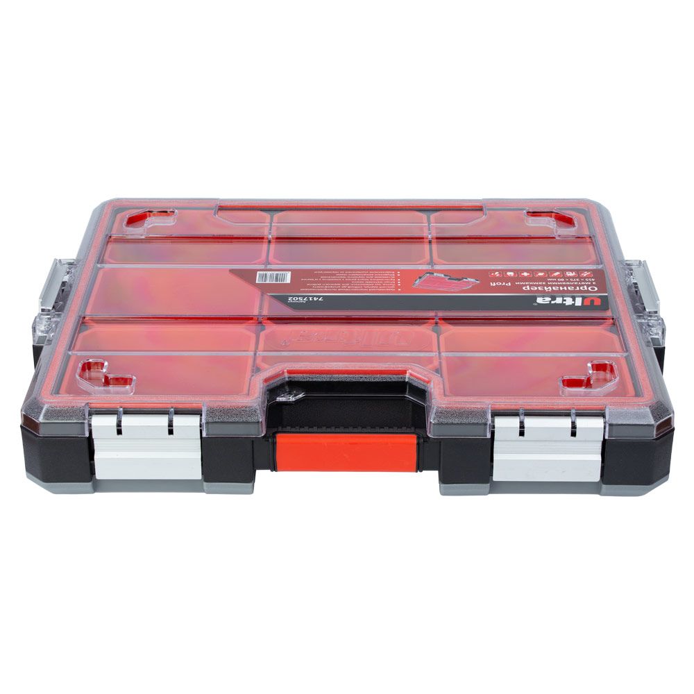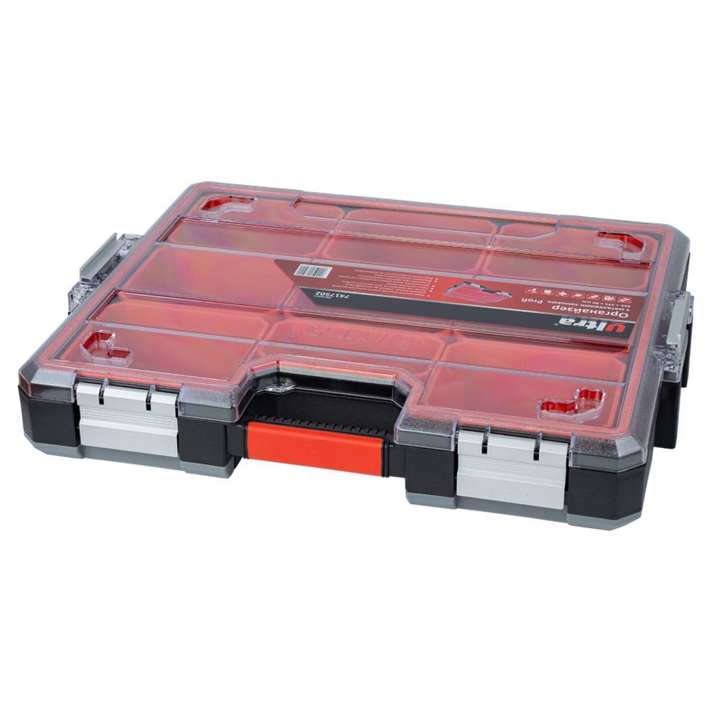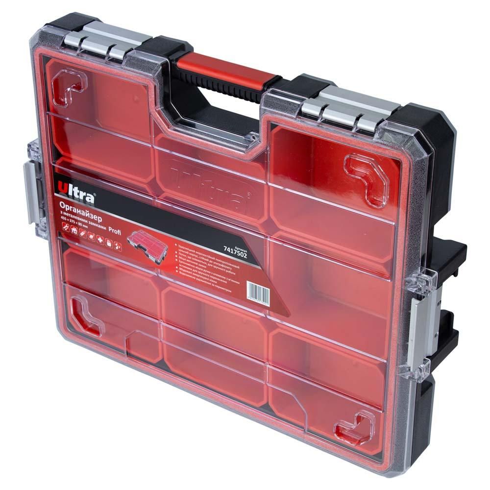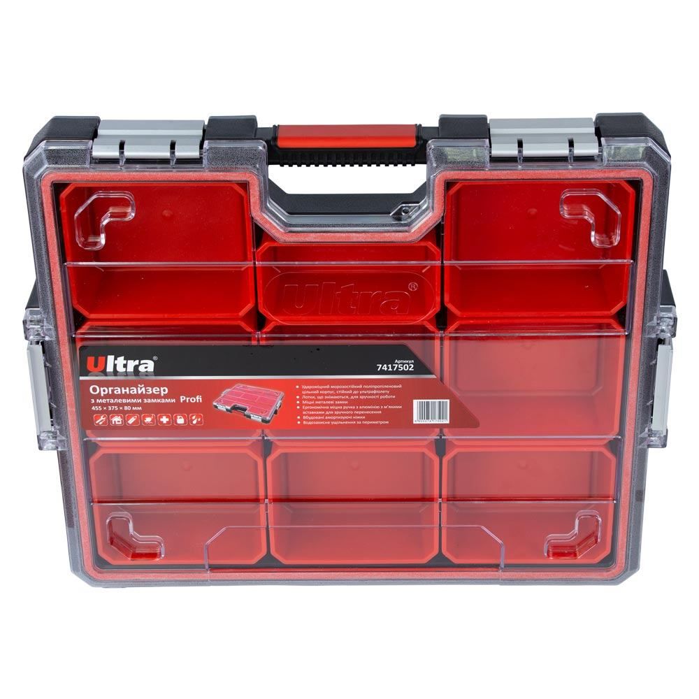 Органайзер ULTRA Profi 45537580 мм із металевими замками (7417502) призначений для зберігання, транспортування та зручного доступу до ручного інструменту й дрібних деталей. Конструкція дозволяє системно організувати зберігання кріплення, шайб, гайок та інших елементів.