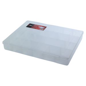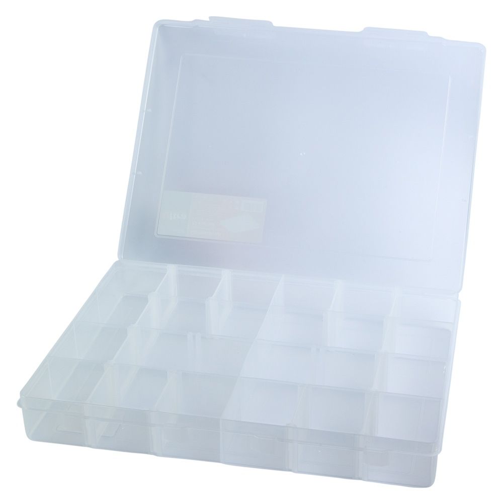 Переваги 20 відсіків для впорядкованого зберігання Прозора кришка для зручного огляду вмісту Міцний пластиковий корпус Компактний розмір для зберігання та транспортування Надійні засувки для фіксації