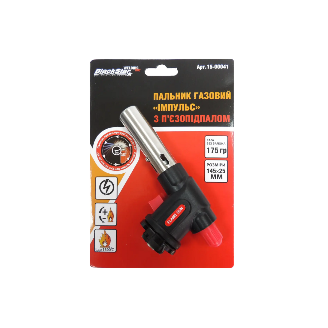 Основні переваги пальника 'Імпульс', 'BlackStar Welding Line':- Висока якість і надійність- П'єзопідпалювання для зручного запалювання- Чорний колір для стильного вигляду- Застосування в різноманітних сферах