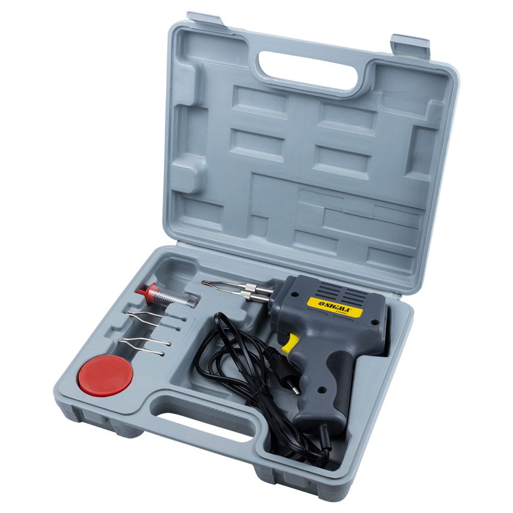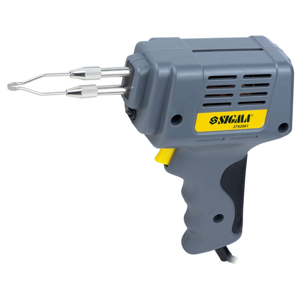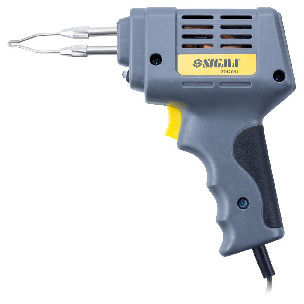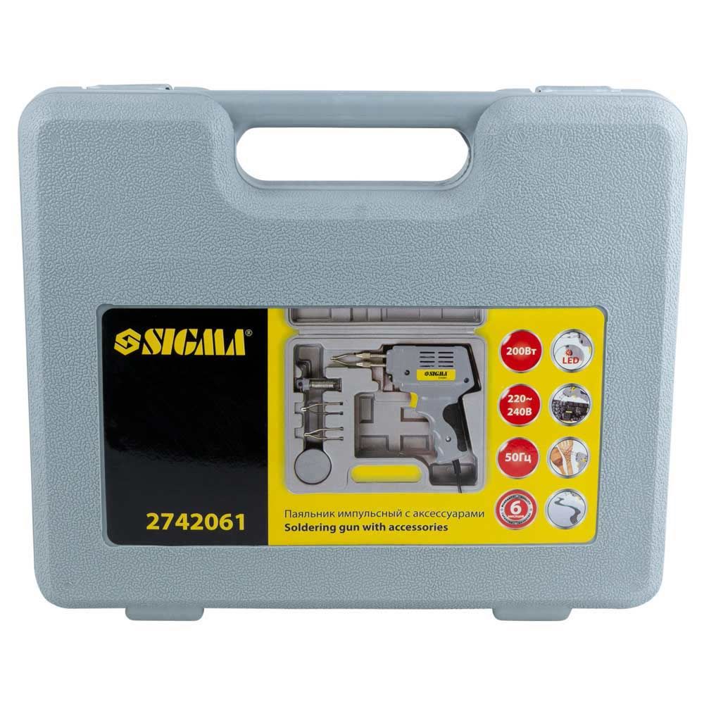 Паяльник імпульсний 200Вт + аксесуари 5шт кейс SIGMA (2742061) призначений для пайки радіоелементів при проведенні монтажних робіт олов'яно-свинцевим припоєм, демонтажу електронних пристроїв, випалювання по дереву або шкірі, зварювання або різання пластмасових деталей.