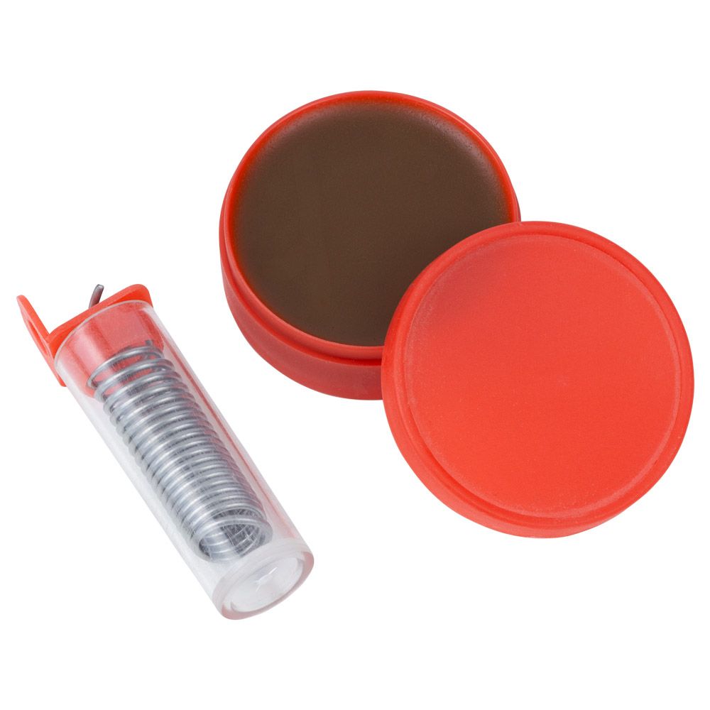 У набір входить: дві насадки для пайки, одна насадка для різання пластику, олово, каніфоль.