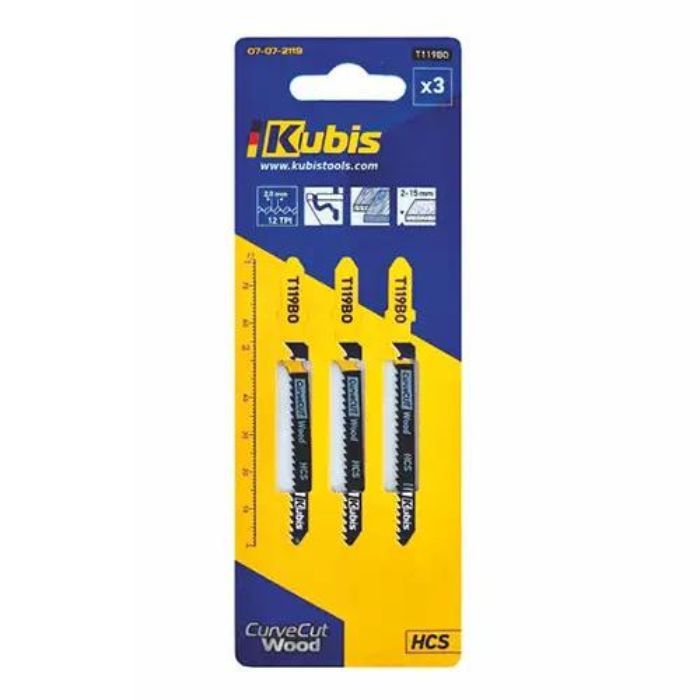 Пильне полотно для лобзика, призначене для різання деревини, фанери, пластику, ДСП, ДВП та ламінату. матеріал пилки - HCS. Розмір пильного полотна - 3 штуки. Товщина різання від 2 до 15 мм. Зуби полотна мають розмір 2.0 T119BO. Робоча довжина полотна - 55 мм. Тип розрізу - прямий.