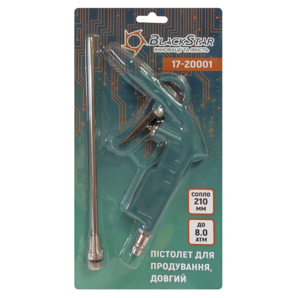 Продувний пістолет працює від стисненого повітря під тиском 1–8 атм та призначений для очищення, продування й видалення забруднень у різних сферах.