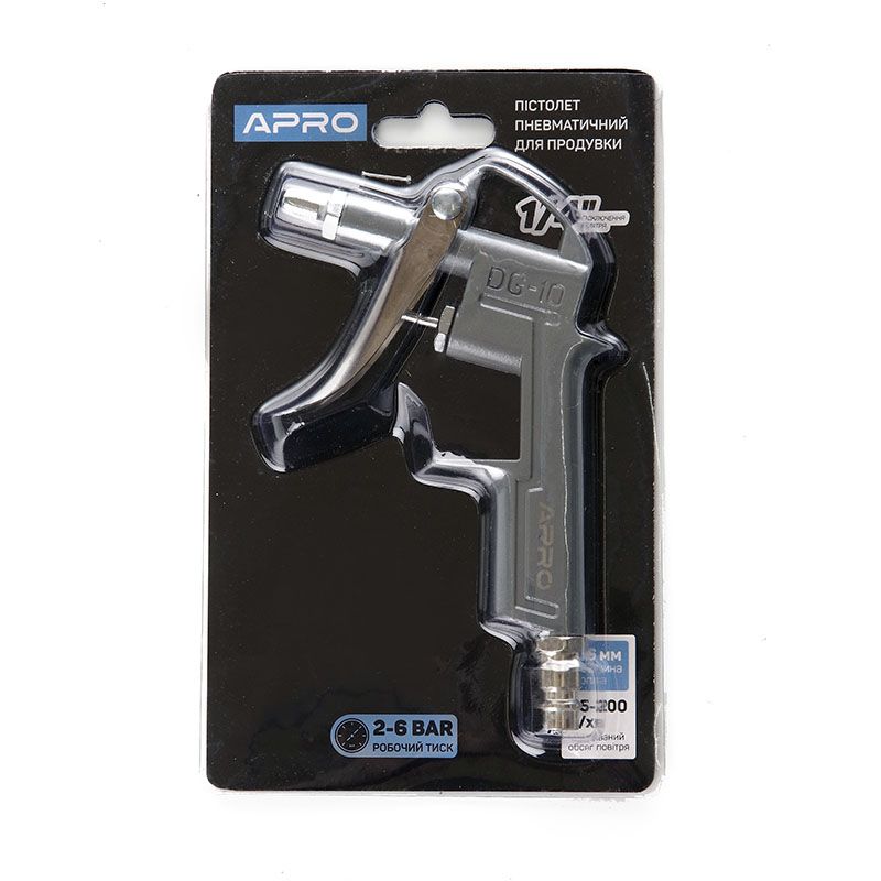 Вид пістолета: продувальний Бренд: Apro Технічні особливості Витрата повітря: 200 л/хв Робочий тиск: 2 бар, 3 бар, 4 бар, 5 бар, 6 бар Діаметр сопла: 26 мм Діаметр приєднання: 1/4 "