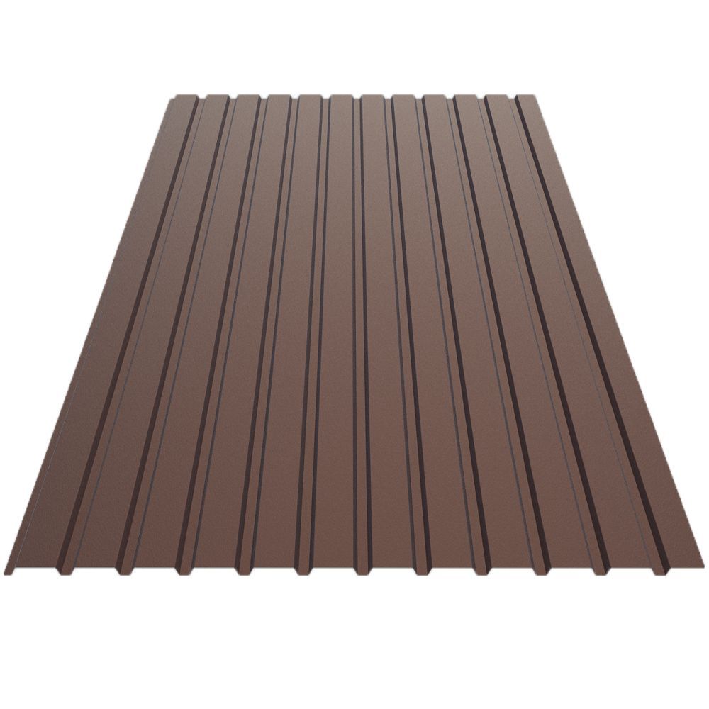 Основні характеристики: Ширина листа: 1200 мм Довжина листа: 6000 мм Площа одного листа: 7,2 м Товщина сталі: 0,4 мм Висота хвилі (гофри): 10 мм Тип покриття: матове полімерне (одностороннє) Колір: темно-коричневий (RAL 8017) матеріал: оцинкована сталь Форма хвилі: трапецієподібна