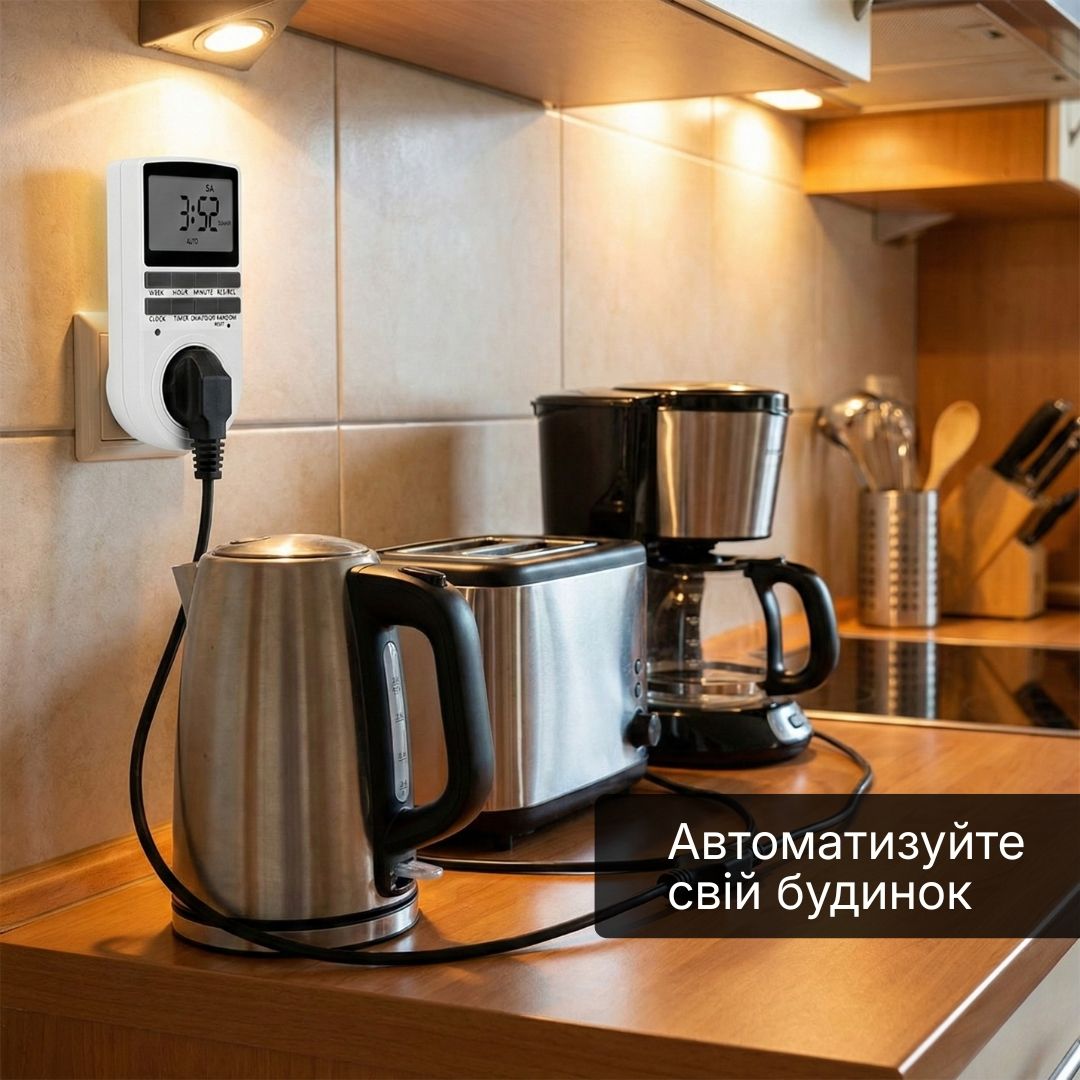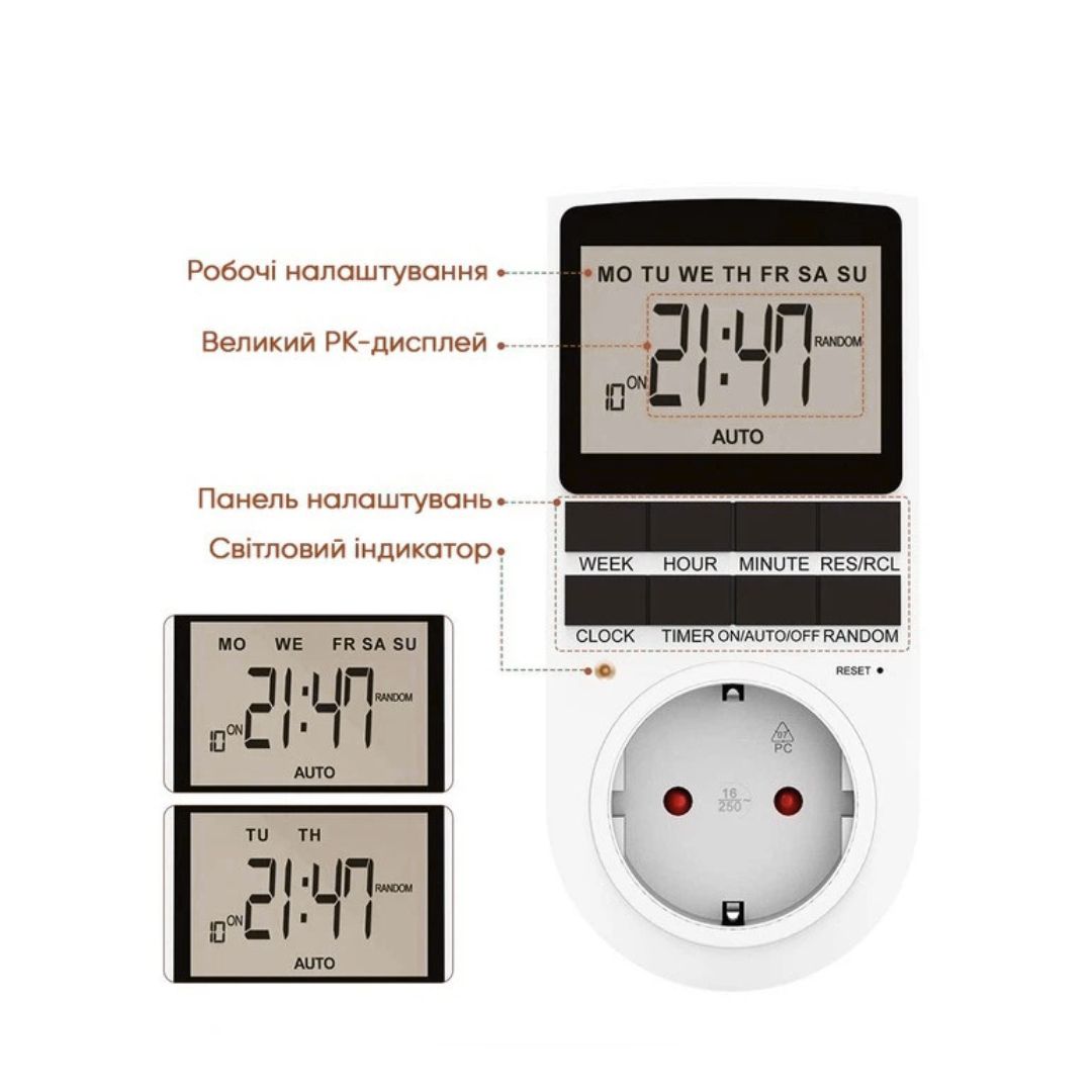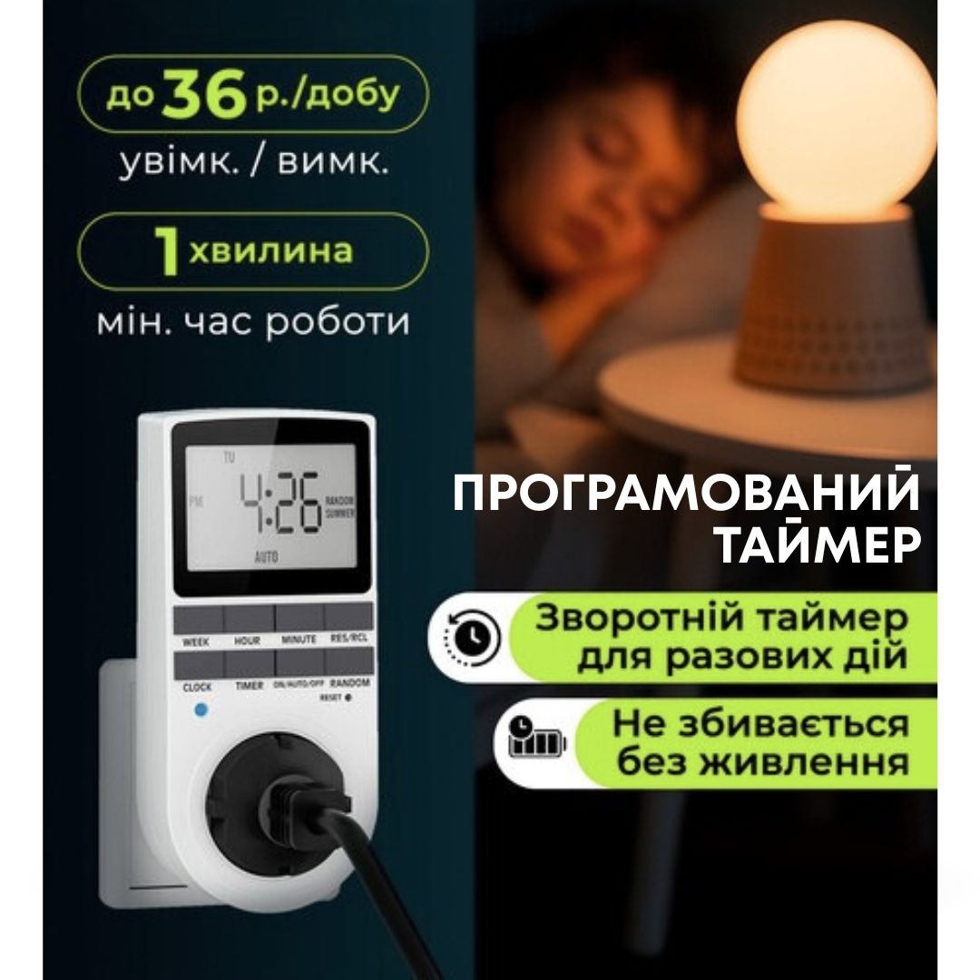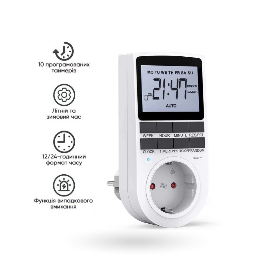 Розетка з таймером РТЦ-3 з підсвіткою дисплея — зручне рішення для автоматичного керування електроприладами вдома, в офісі або на дачі. Дозволяє програмувати час увімкнення та вимкнення з точністю до 1 хвилини та підтримує до 10 незалежних програм. Оснащена підсвіткою дисплея з автовимкненням для комфортного налаштування у темний час доби.