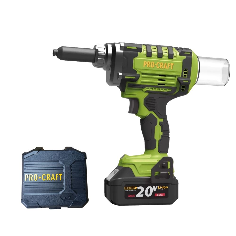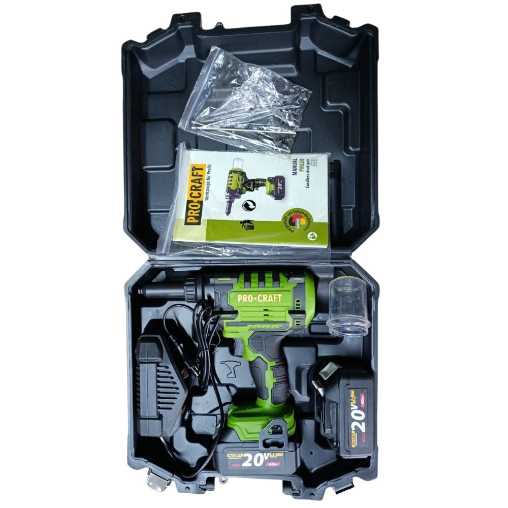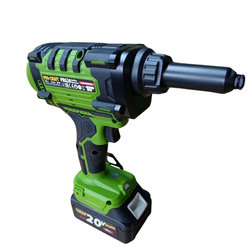 Procraft PRG20 - профессиональный аккумуляторный заклепочный пистолет с бесщеточным двигателем, созданный для монтажа алюминиевых, стальных и нержавеющих вытяжных заклепок. Работает автономно, без провода, позволяет выполнять работы быстро, чисто и с минимальным усилием.