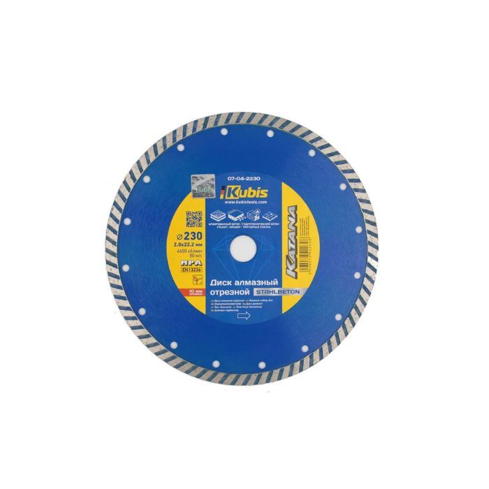 Диск алмазный отрезной TURBO STAHLBETON 230*22.2 мм, 2.8*10 мм, KATANA - это высококачественный и эффективный инструмент для резки керамики, гранита, мрамора и других материалов. Диск имеет посадочный диаметр 22.2 мм и диаметр 230 мм. Он выполнен в типе сплошного диска, что обеспечивает максимальную прочность и пробивную способность. Этот диск идеально подходит для профессионального использования и обеспечивает чистый и быстрый разрез материалов. Благодаря высокому качеству и надежности, диск TURBO STAHLBETON 230*22.2 мм, 2.8*10 мм, KATANA является незаменимым инструментом для строительных и ремонтных работ.