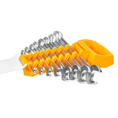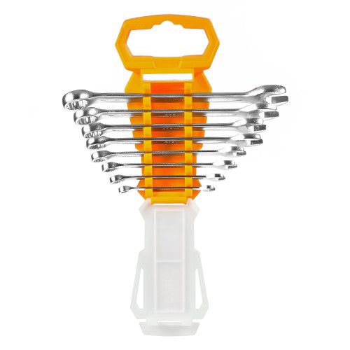 Комплект комбинированных гаечных ключей 6–19 мм INGCO INDUSTRIAL - это набор универсальных и надежных инструментов, которые станут незаменимым помощником для выполнения ремонтных работ, автомобильного обслуживания или любых других сфер использования. Каждый ключ изготовлен из стали высокого качества, что обеспечивает его прочность и долговечность. Набор содержит 8 ключей разных размеров, что позволяет удобно работать с деталями разных размеров. Благодаря комбинированному профилю, гаечные ключи можно использовать как для откручивания гаек, так и для закручивания. Комплект занимает мало места и может быть удобно храниться в гараже, мастерской или автомобиле.