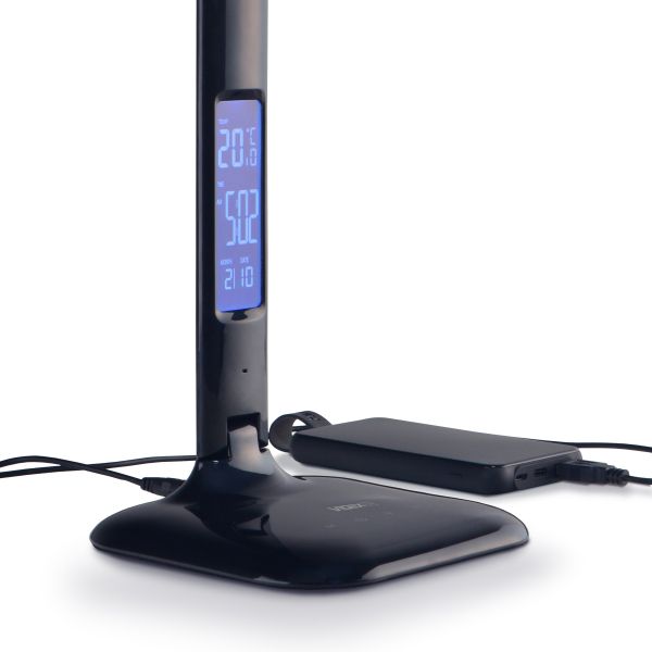Конструкция позволяет складывать лампу пополам, экономит рабочее место днем и удобна для эксплуатации и транспортировки. С помощью подвижного крепежа вы легко сможете изменить угол освещения. Угол рассеяния света в данной настольной лампе составляет 120°. LCD дисплей показывает часы, будильник, календарь, термометр. Подсветку ЖК-дисплея в случае необходимости можно отключить. Дисплей можно настроить с помощью кнопок на обратной стороне корпуса настольной лампы.