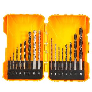 Комплектация: Набор содержит 16 штук сверл: 8 сверл по металлу, 4 сверла по бетону и 4 сверла по дереву.